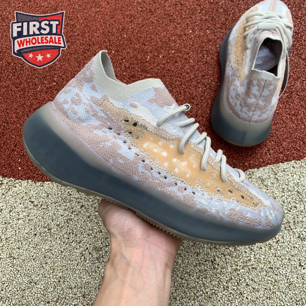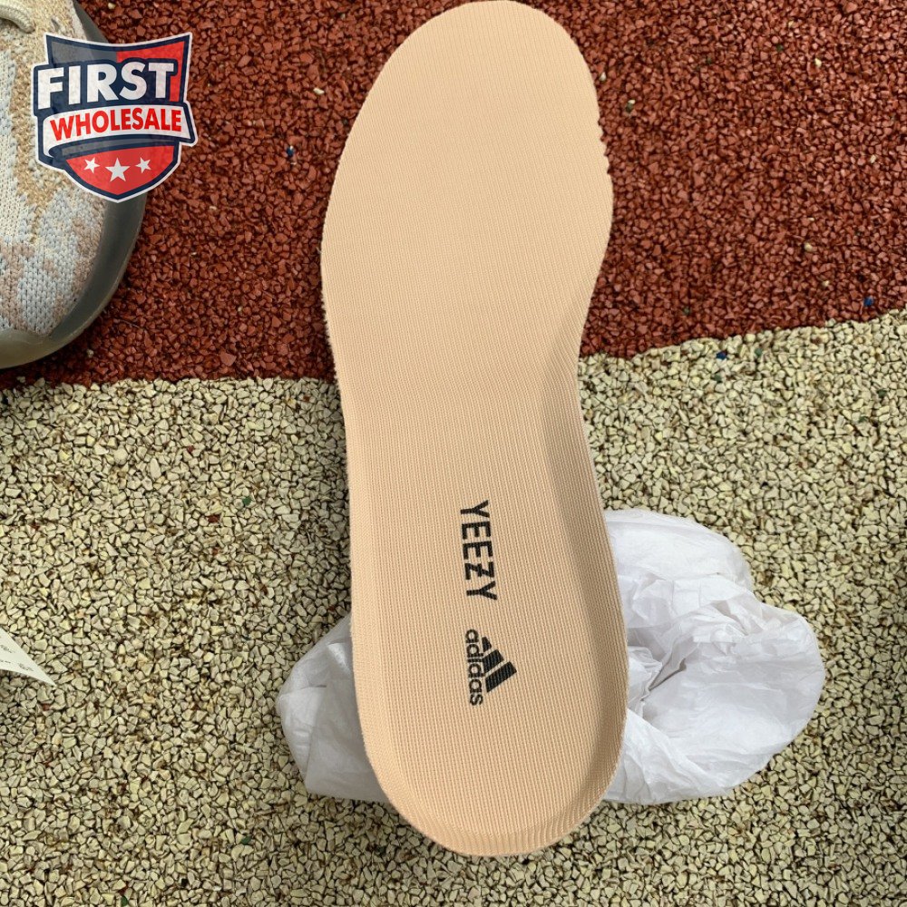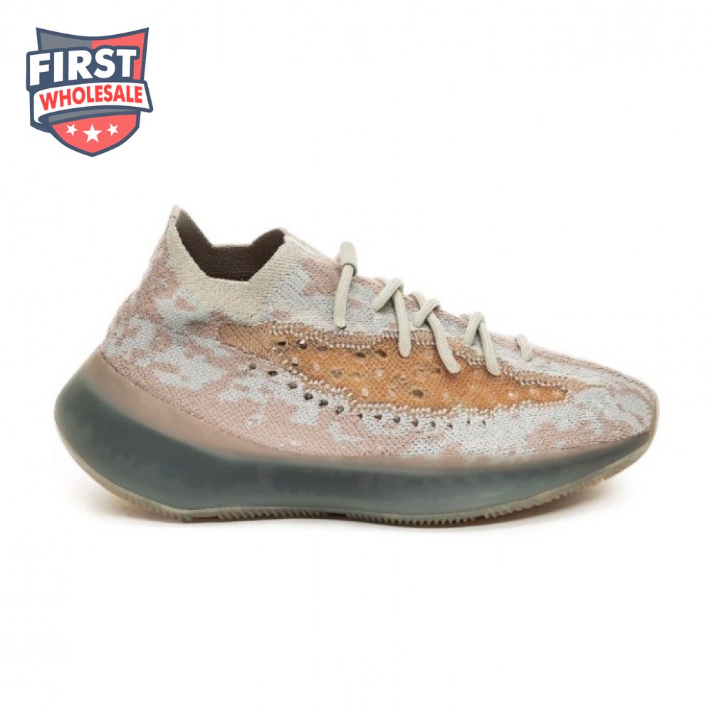 The adidas Yeezy Boost 380 "Pepper Reflective" offers sock-like comfort on the upper, crafted from subtly patterned Primeknit in a blend of light grey and beige hues. Reflective fibers are woven into the mix, offering enhanced visibility in low-light conditions. A coppery finish distinguishes the post-dyed monofilament side stripe, adding a see-through element to the minimalist build. A greyish-blue rubber cage envelops the full-length Boost midsole.