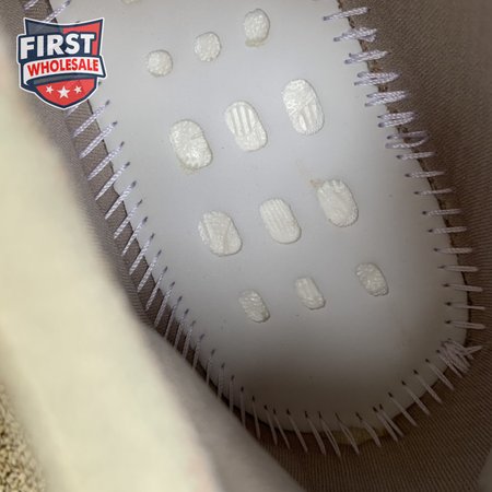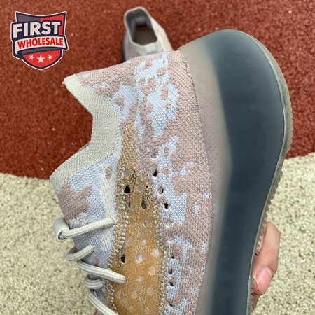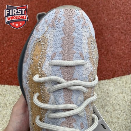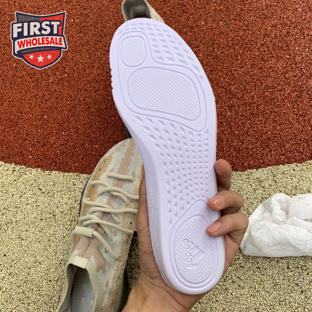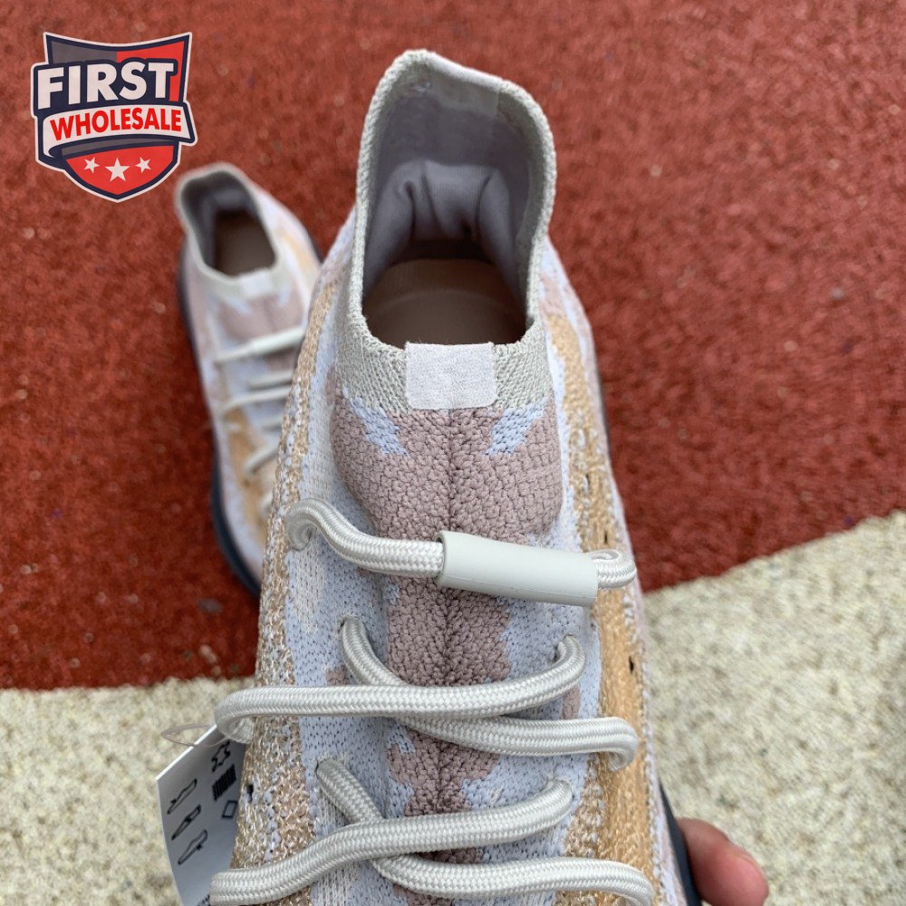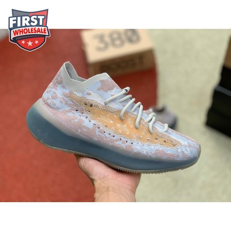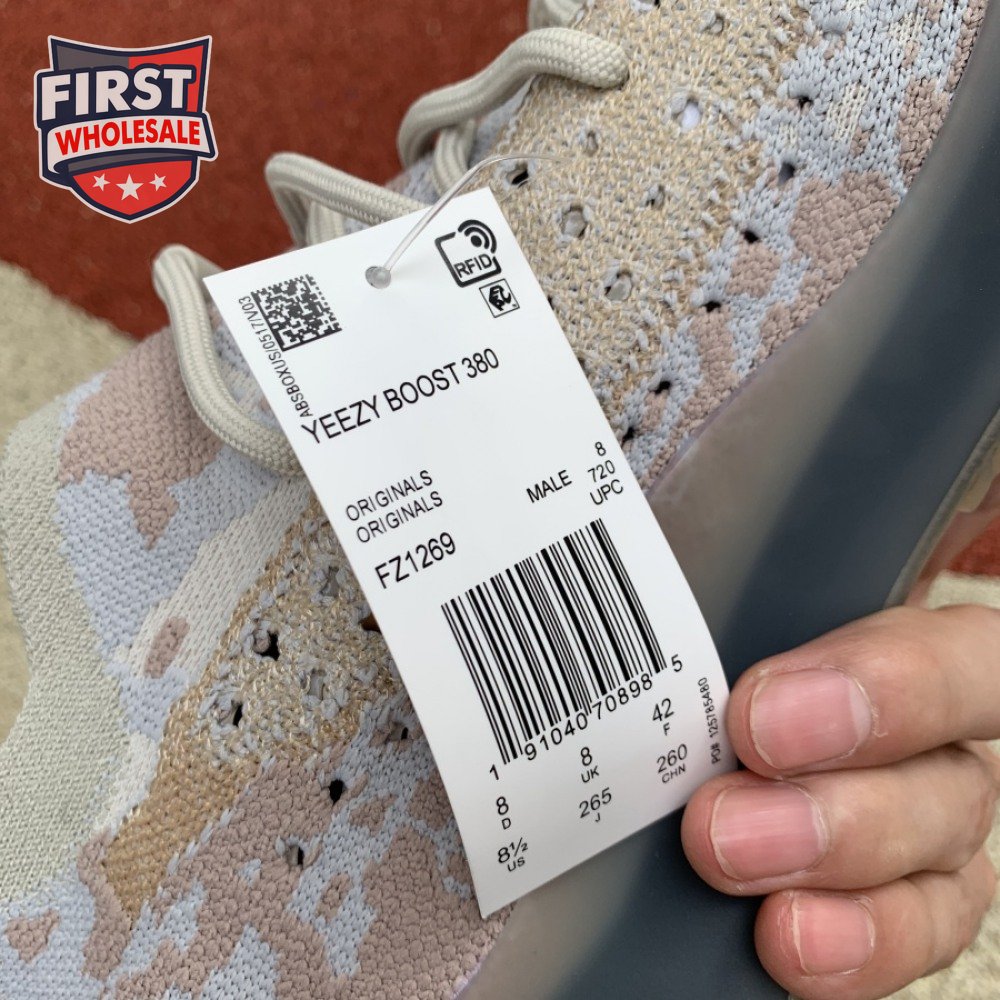 The adidas Yeezy Boost 380 "Pepper Reflective" offers sock-like comfort on the upper, crafted from subtly patterned Primeknit in a blend of light grey and beige hues. Reflective fibers are woven into the mix, offering enhanced visibility in low-light conditions. A coppery finish distinguishes the post-dyed monofilament side stripe, adding a see-through element to the minimalist build. A greyish-blue rubber cage envelops the full-length Boost midsole.