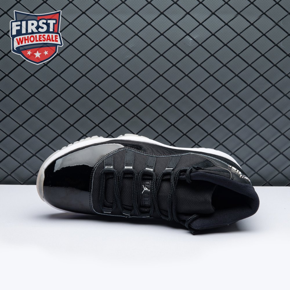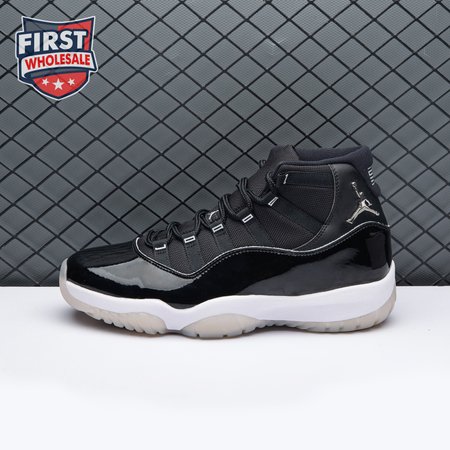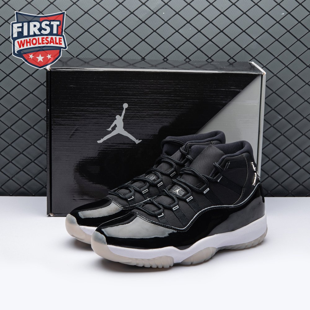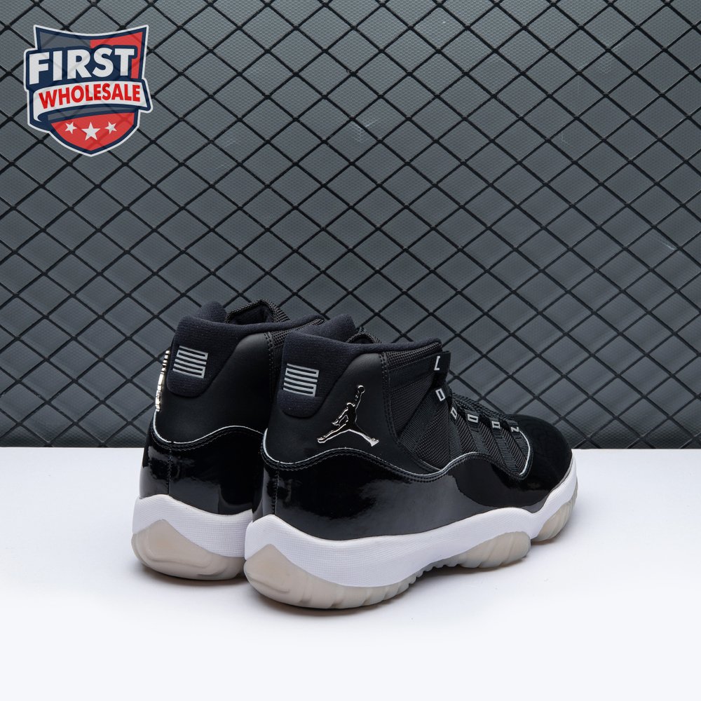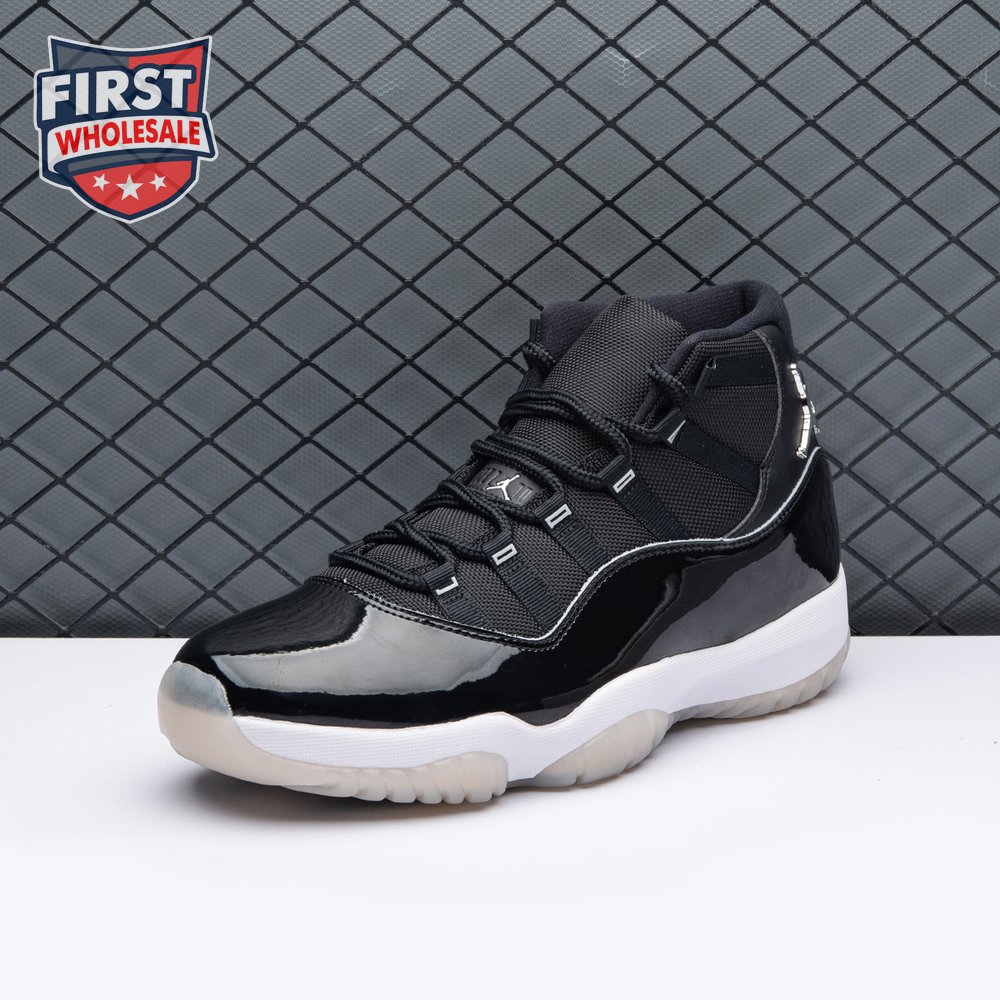 The Air Jordan 11 "Jubilee", also known as the Air Jordan 11 '25th Anniversary', celebrates the classic silhouette"s quarter-century birthday with a monochrome black finish throughout the upper, constructed from a traditional blend of ballistic mesh and patent leather. In keeping with the shoe"s silver anniversary, a 3D metallic Jumpman and matching "23" branding decorate the heel, while "Jordan" is spelled out in stylized silver lettering on each of the sneaker"s eyelets. The mid-top rides on a classic white foam midsole, supported by a translucent rubber outsole.