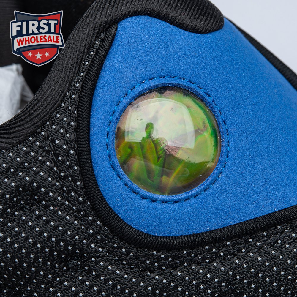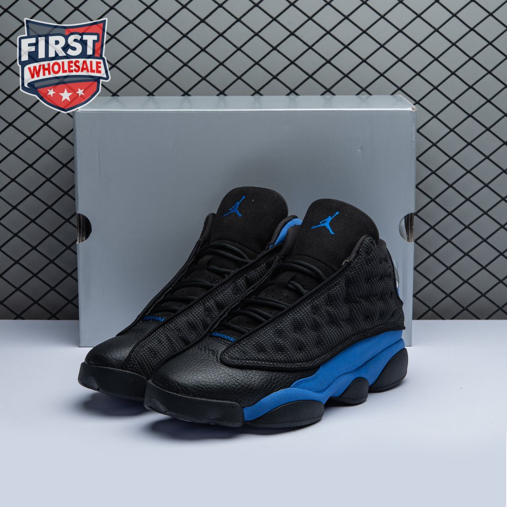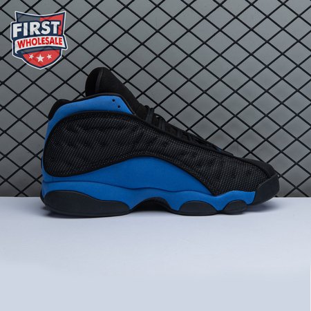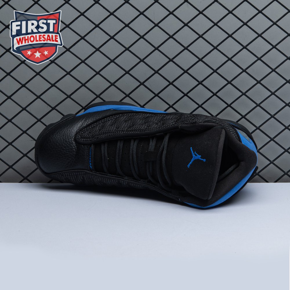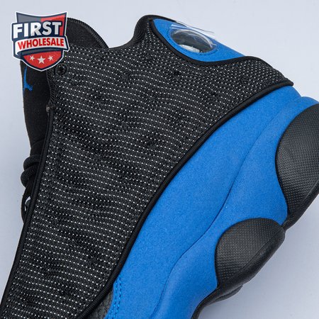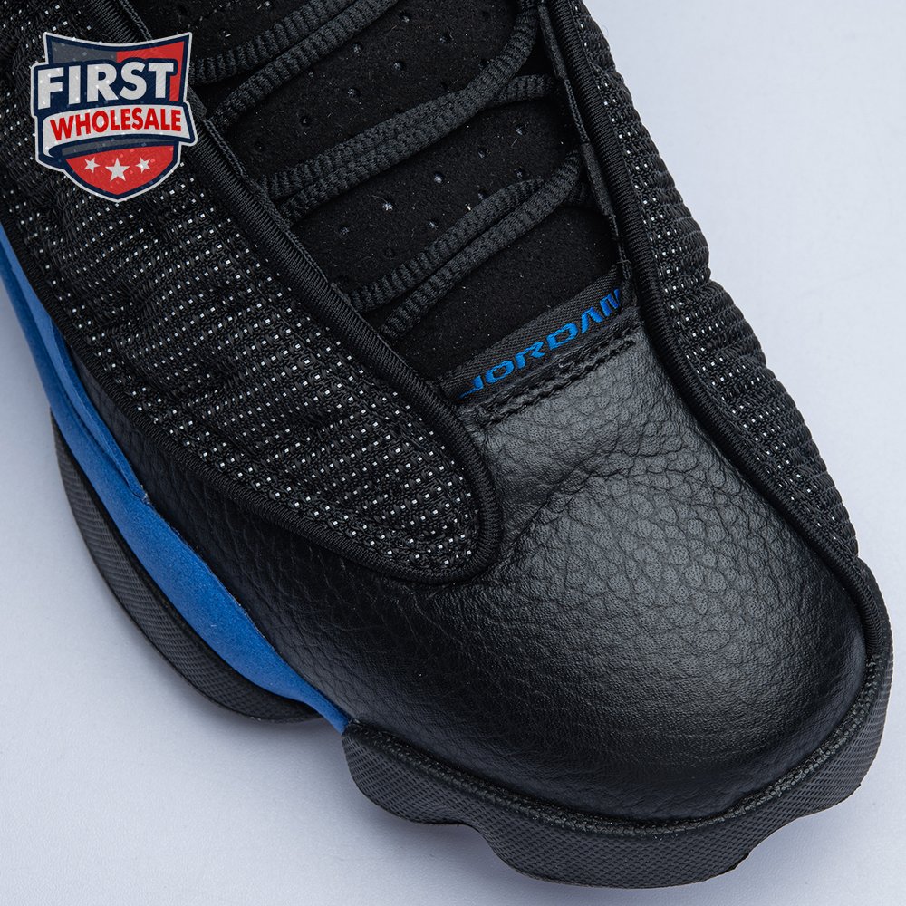 The Air Jordan 13 Retro "Black Royal" features a two-tone design reminiscent of Quentin Richardson"s Orlando Magic PE from 2012. The upper combines black tumbled leather, royal blue suede and reflective mesh overlays. Branding elements include the signature holographic eye and a blue Jumpman logo embroidered atop the tongue. The distinctive cat"s paw outsole is equipped with herringbone rubber for grippy traction underfoot.