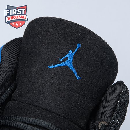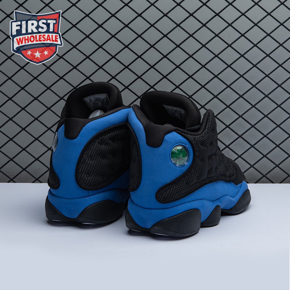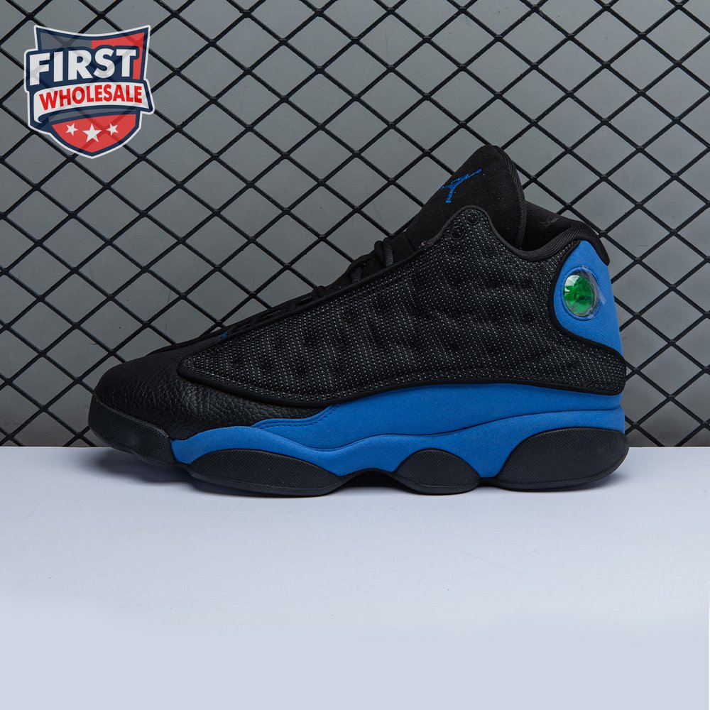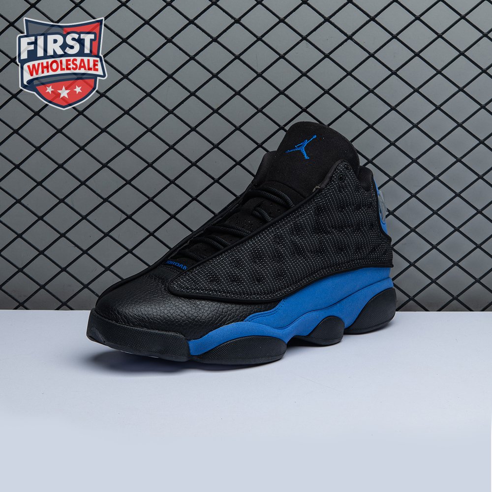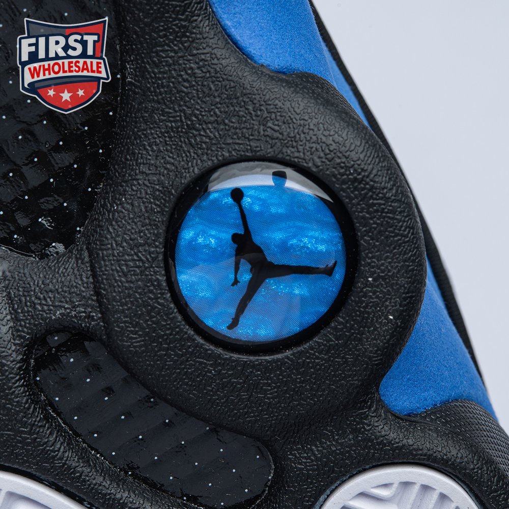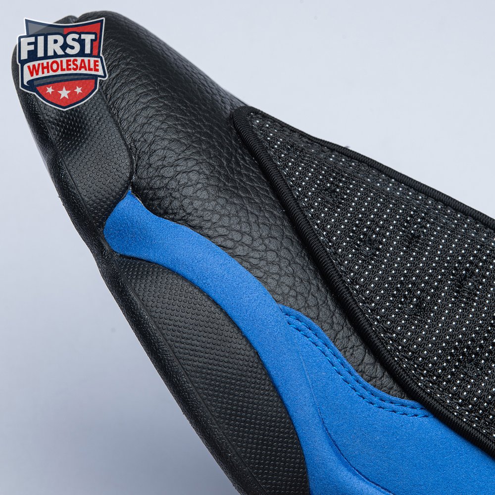 The Air Jordan 13 Retro "Black Royal" features a two-tone design reminiscent of Quentin Richardson"s Orlando Magic PE from 2012. The upper combines black tumbled leather, royal blue suede and reflective mesh overlays. Branding elements include the signature holographic eye and a blue Jumpman logo embroidered atop the tongue. The distinctive cat"s paw outsole is equipped with herringbone rubber for grippy traction underfoot.
