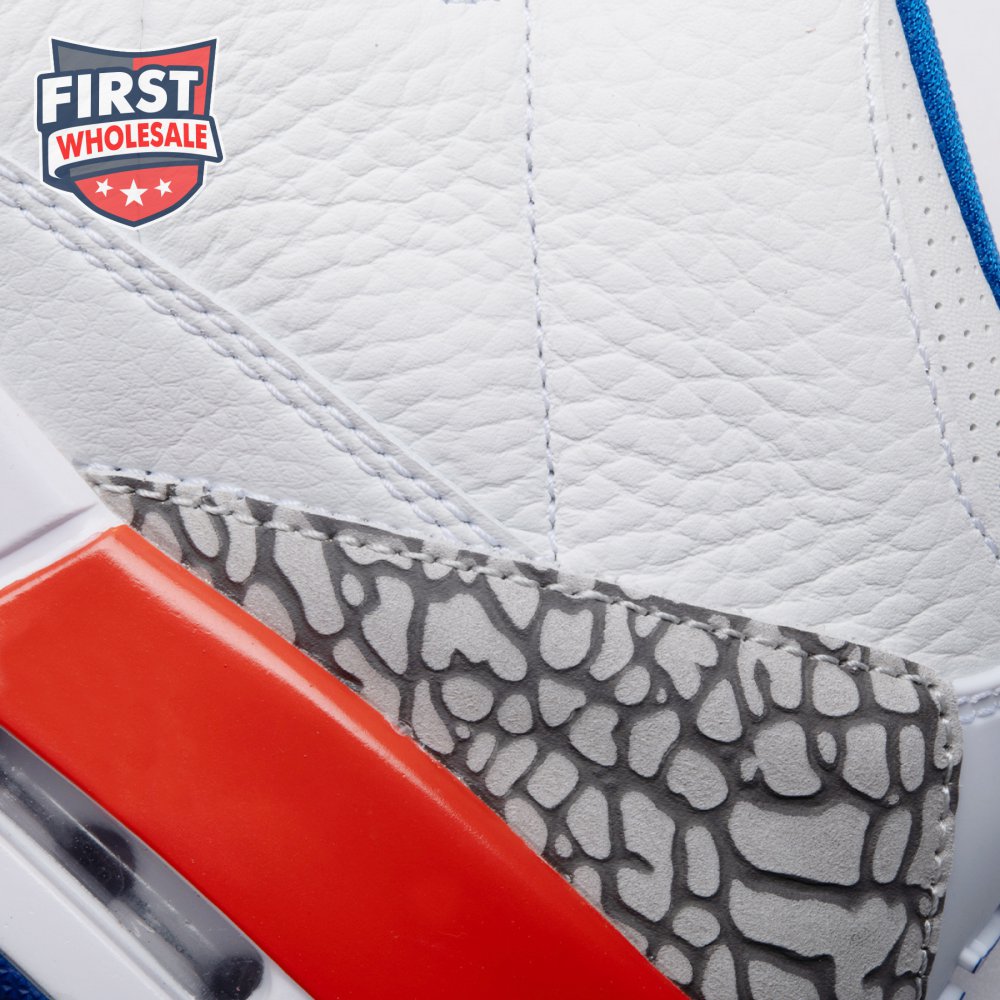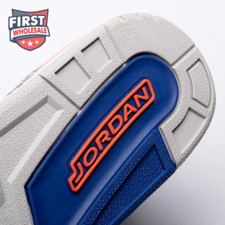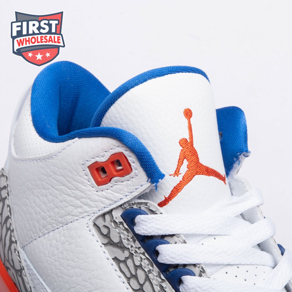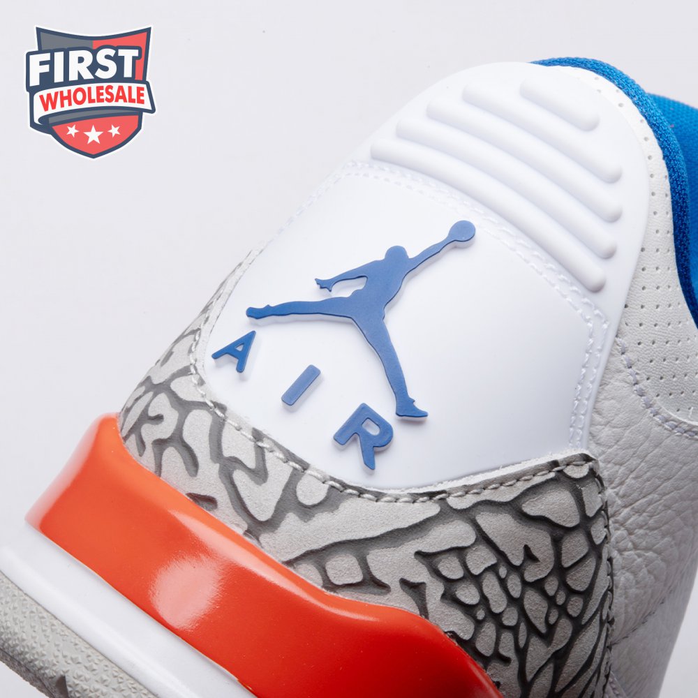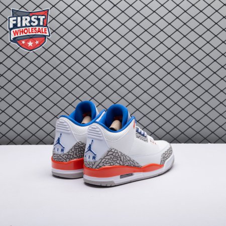 The Air Jordan 3 Retro 'Knicks Rivals' boasts a colorway inspired by a team Michael Jordan and the Chicago Bulls had to hurdle for Eastern Conference dominance, the New York Knicks. The AJ3 was the first of numerous Air Jordans designed by Tinker Hatfield and the debut of the Jumpman logo on the tongue. This 'Knicks Rivals' retro, released in September 2019, stays true to the original silhouette with a white tumbled leather upper, elephant print on the toe cap and heel, Old Royal and University Orange accents, and a visible Nike Air unit.