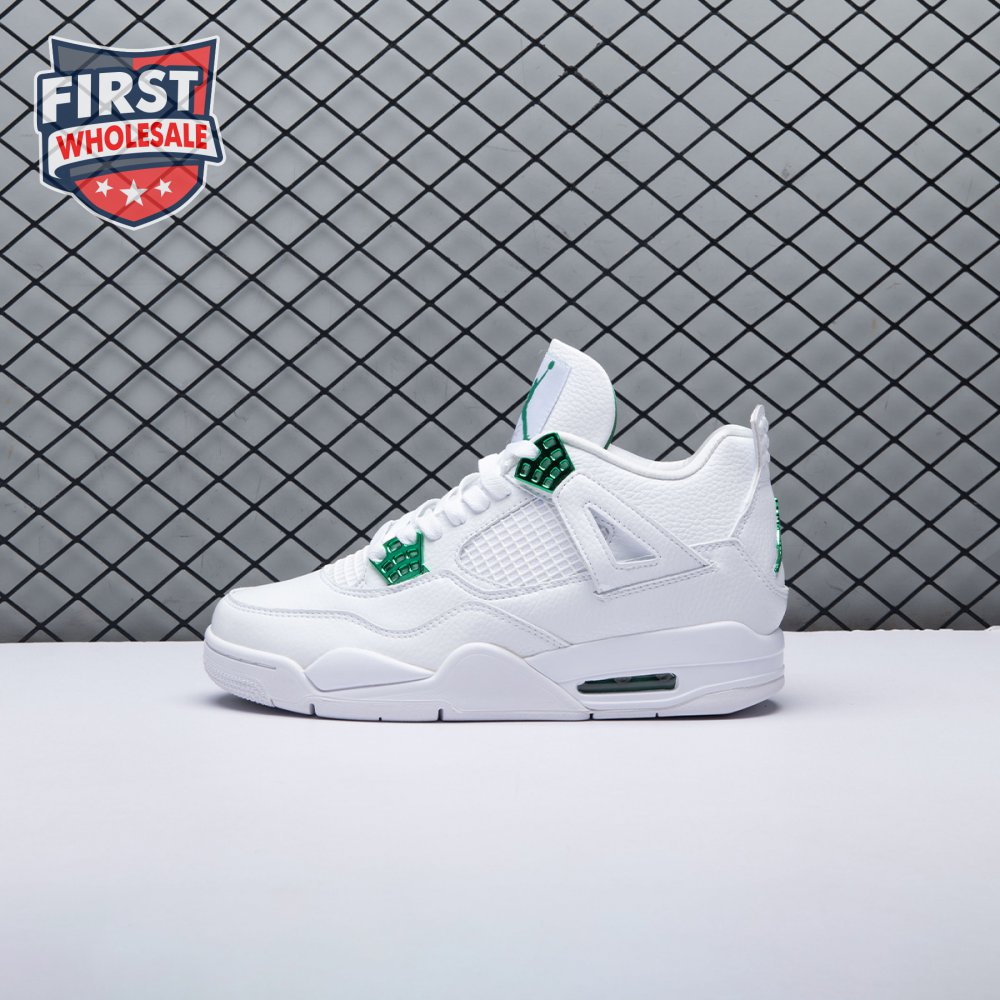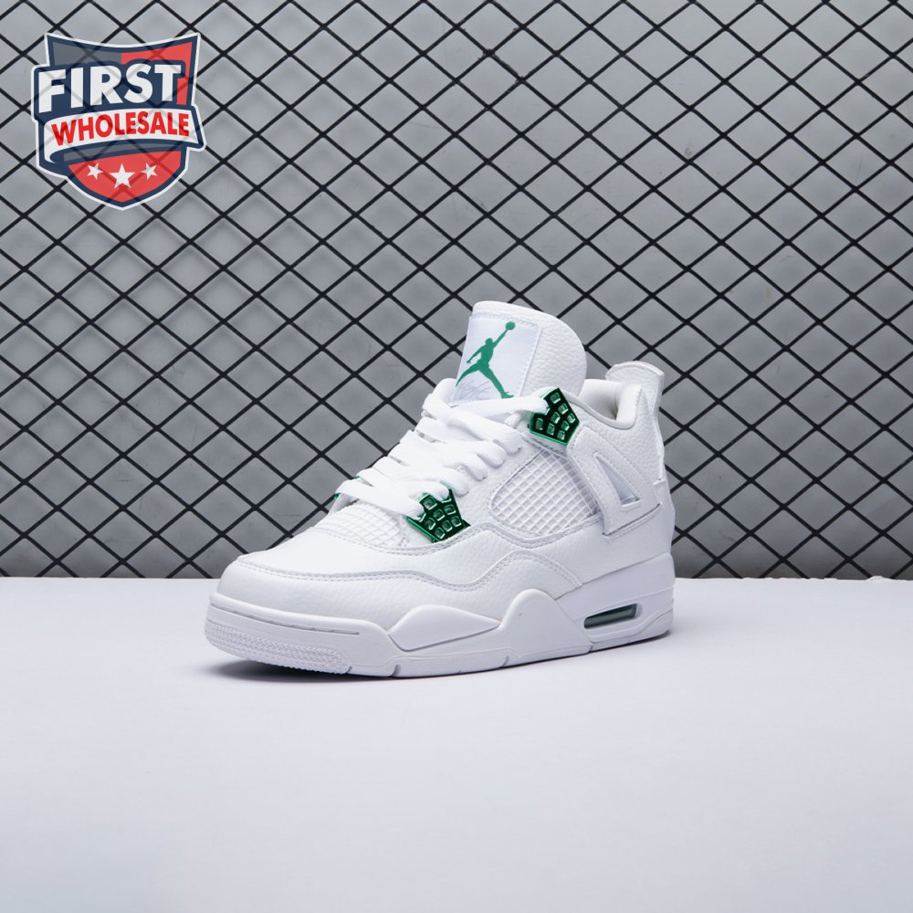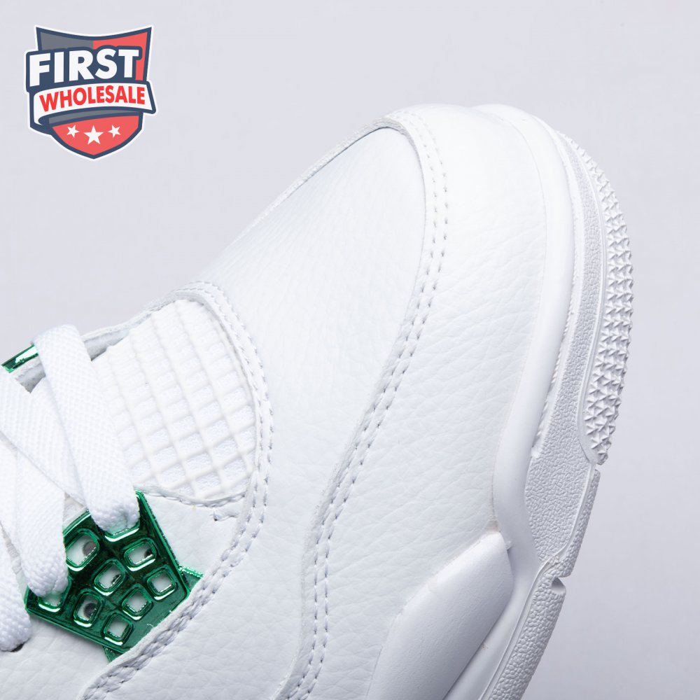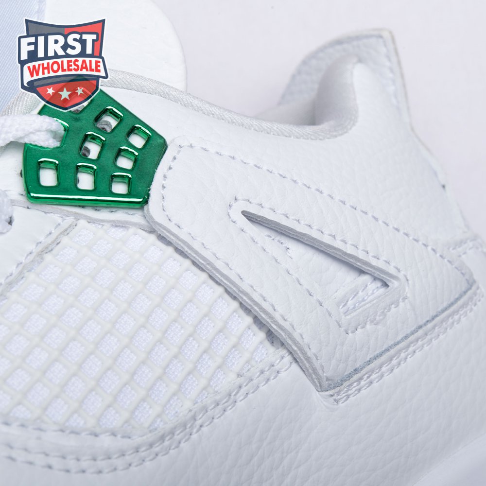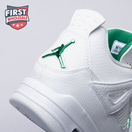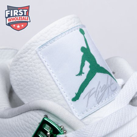 The Air Jordan 4 Retro "Green Metallic" is drawn from a four-piece Metallic Pack that features a single accent color. Here, the metallic green hue is limited to the sneaker"s molded eyelets, interior tongue, and the Jumpman logos that adorn the heel and woven tongue tag. Those elements stand out against a pristine all-white leather build, appointed with standard Air Jordan 4 details that include quarter-panel netting, a visible Air sole unit and an extended pull tab at the heel.
