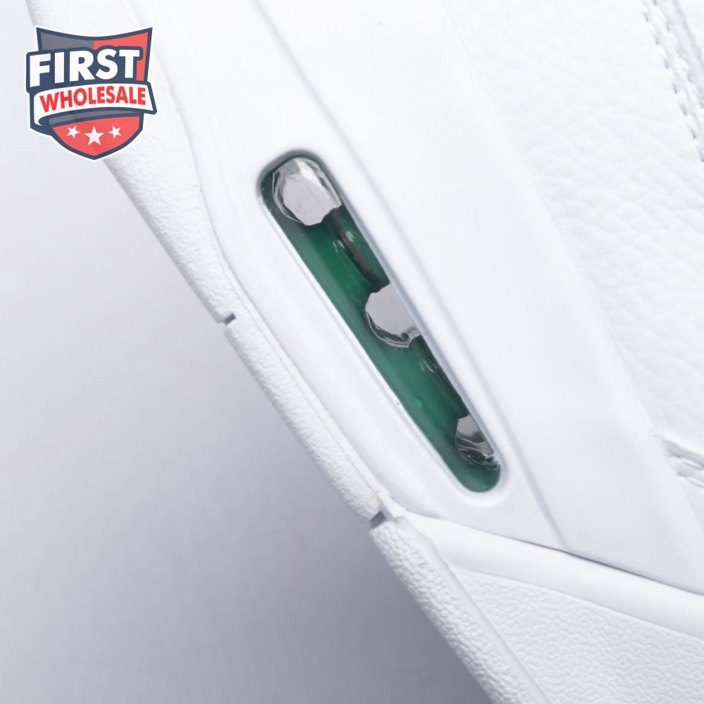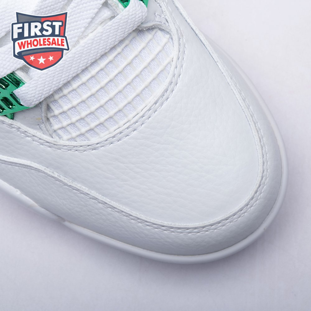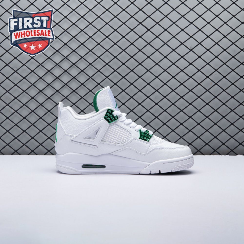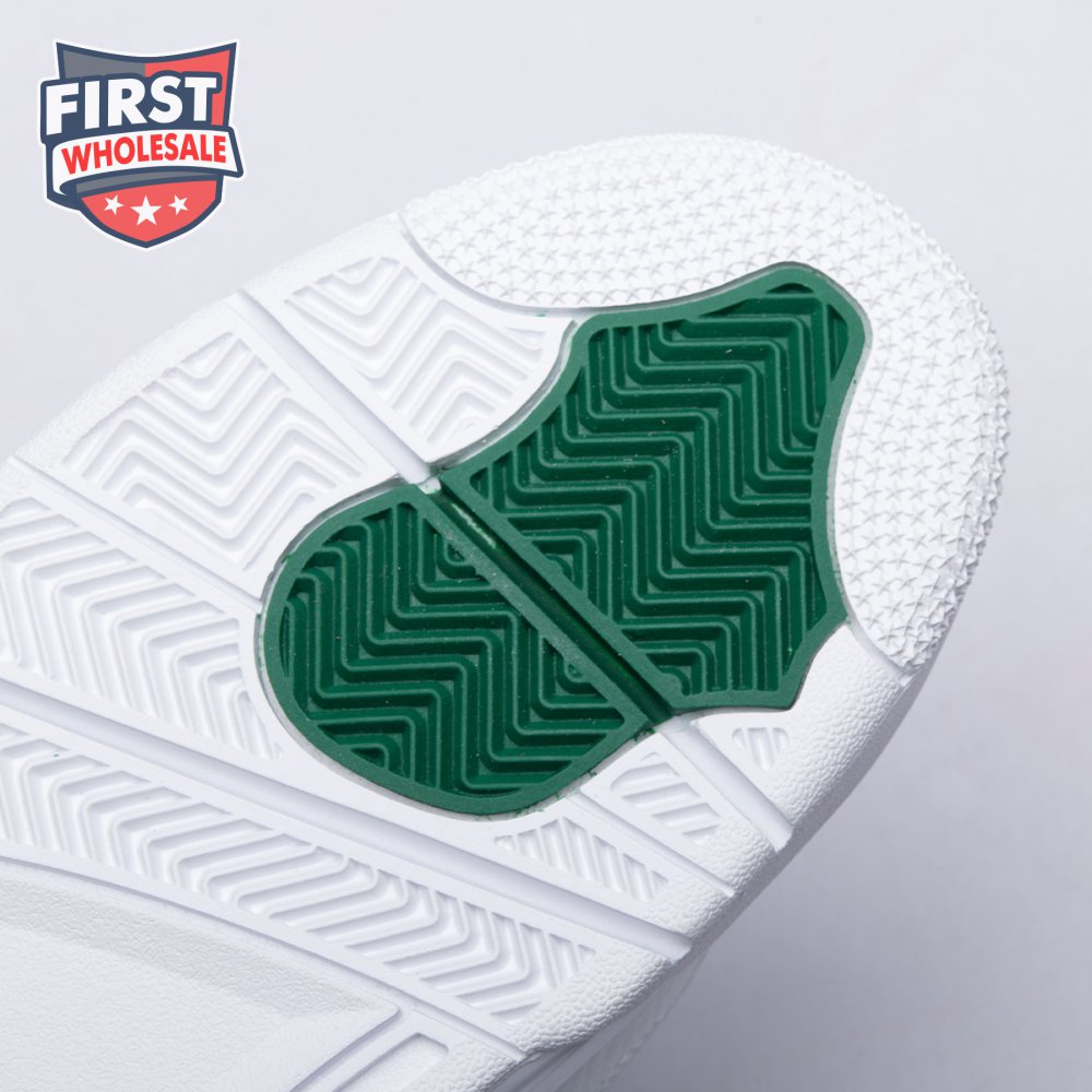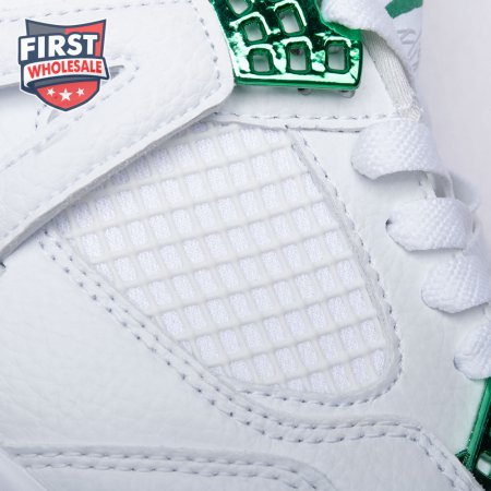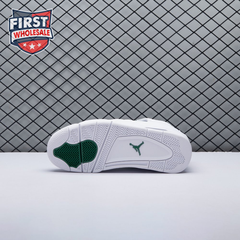 The Air Jordan 4 Retro "Green Metallic" is drawn from a four-piece Metallic Pack that features a single accent color. Here, the metallic green hue is limited to the sneaker"s molded eyelets, interior tongue, and the Jumpman logos that adorn the heel and woven tongue tag. Those elements stand out against a pristine all-white leather build, appointed with standard Air Jordan 4 details that include quarter-panel netting, a visible Air sole unit and an extended pull tab at the heel.