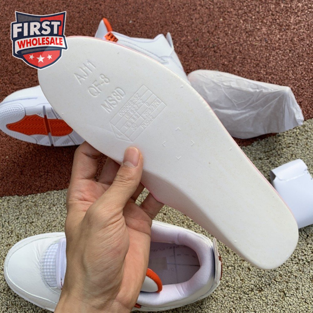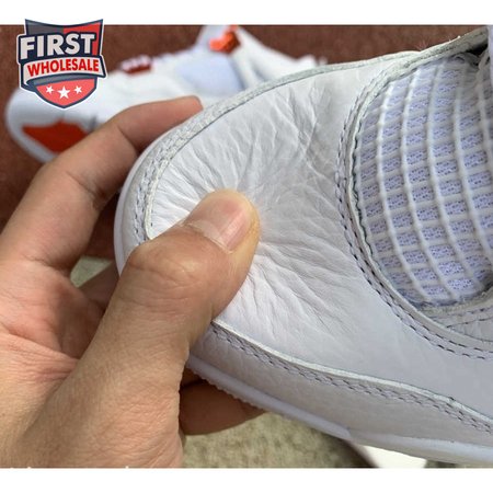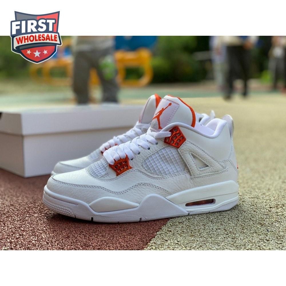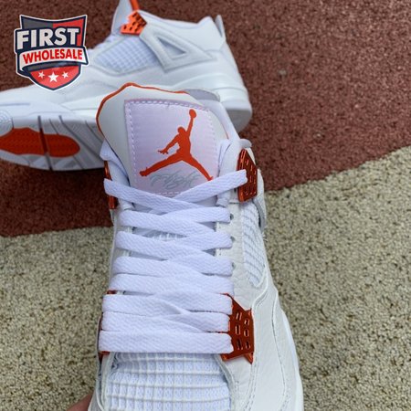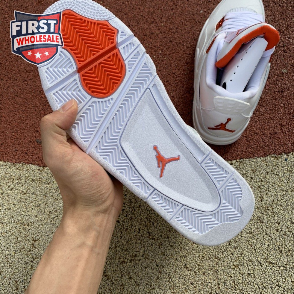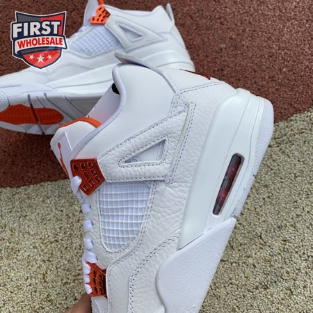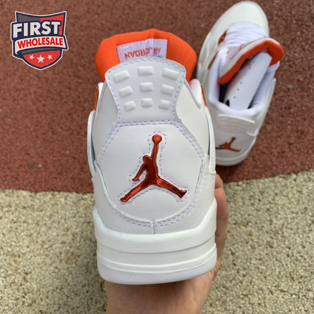 The Air Jordan 4 Retro "Orange Metallic" dons an all-white leather build, with its white monochromatic finish punctuated by sharp bursts of Team Orange on the eyelets, interior tongue and Jumpman branding hits, located on the woven tongue tag and heel. The visible Max Air unit embedded in the heel of the midsole is similarly tinted orange. The kicks dropped alongside three additional colorways in Court Purple, University Red and Pine Green.