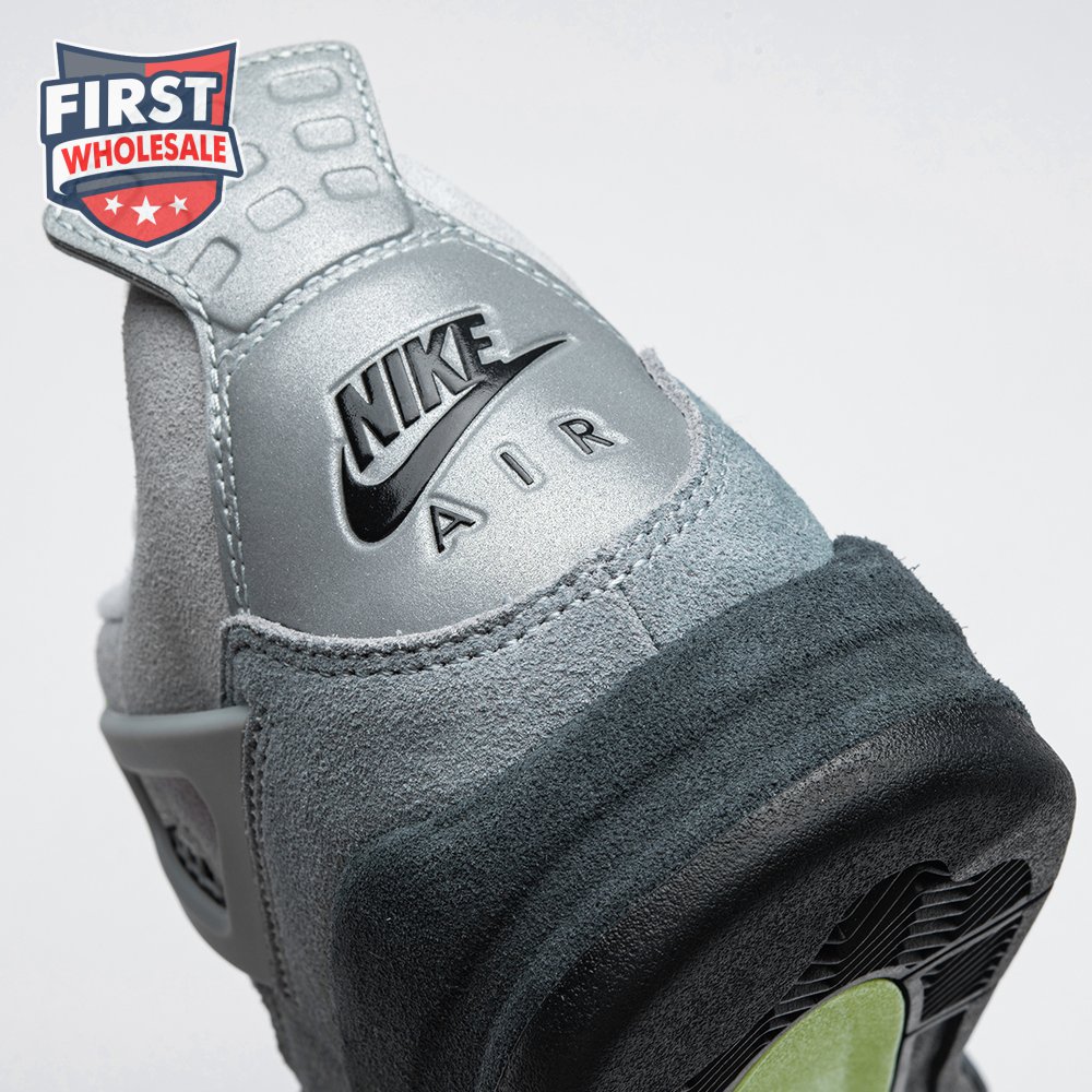 The Air Jordan 4 Retro SE 'Neon 95' draws inspiration from the iconic OG colorway of the Air Max 95, featuring varying shades of grey on the suede upper. Vibrant pops of neon yellow appear on the eyelets, quarter panel netting and the Nike Air logo that adorns the molded heel panel. The mid-top rides on a solid black midsole, fitted with a visible Air sole unit in the heel tinted neon yellow.