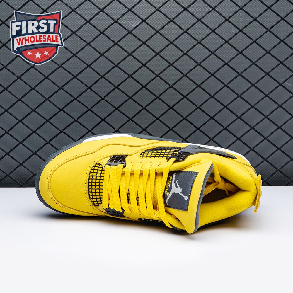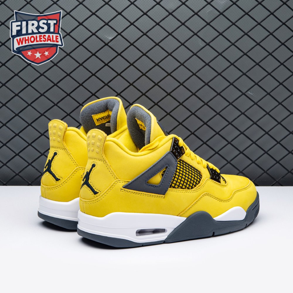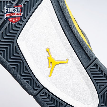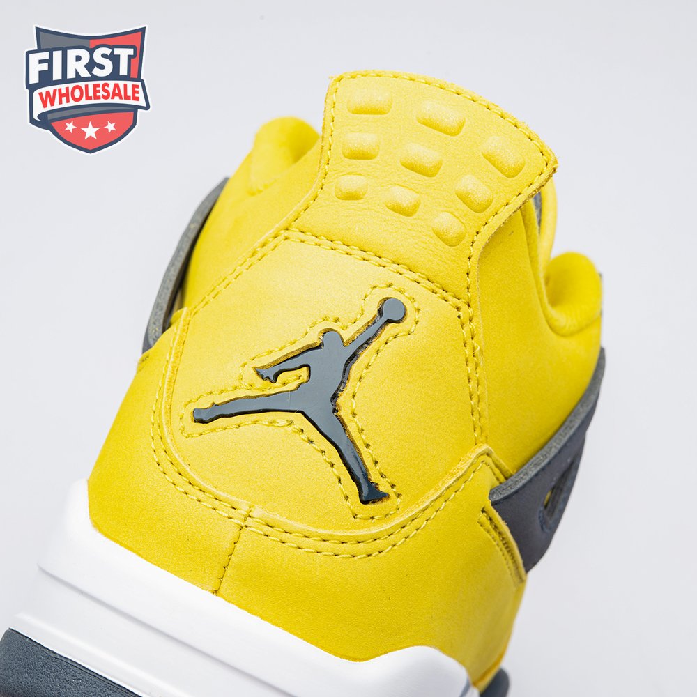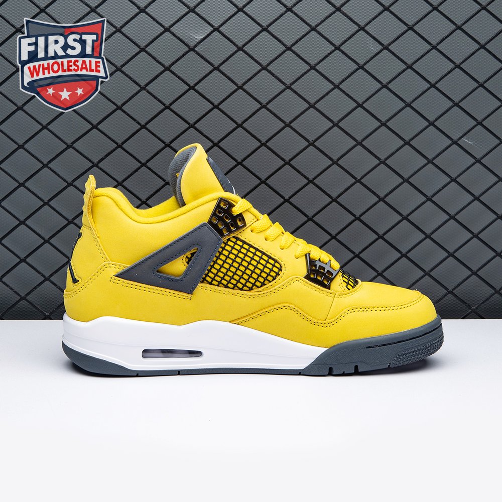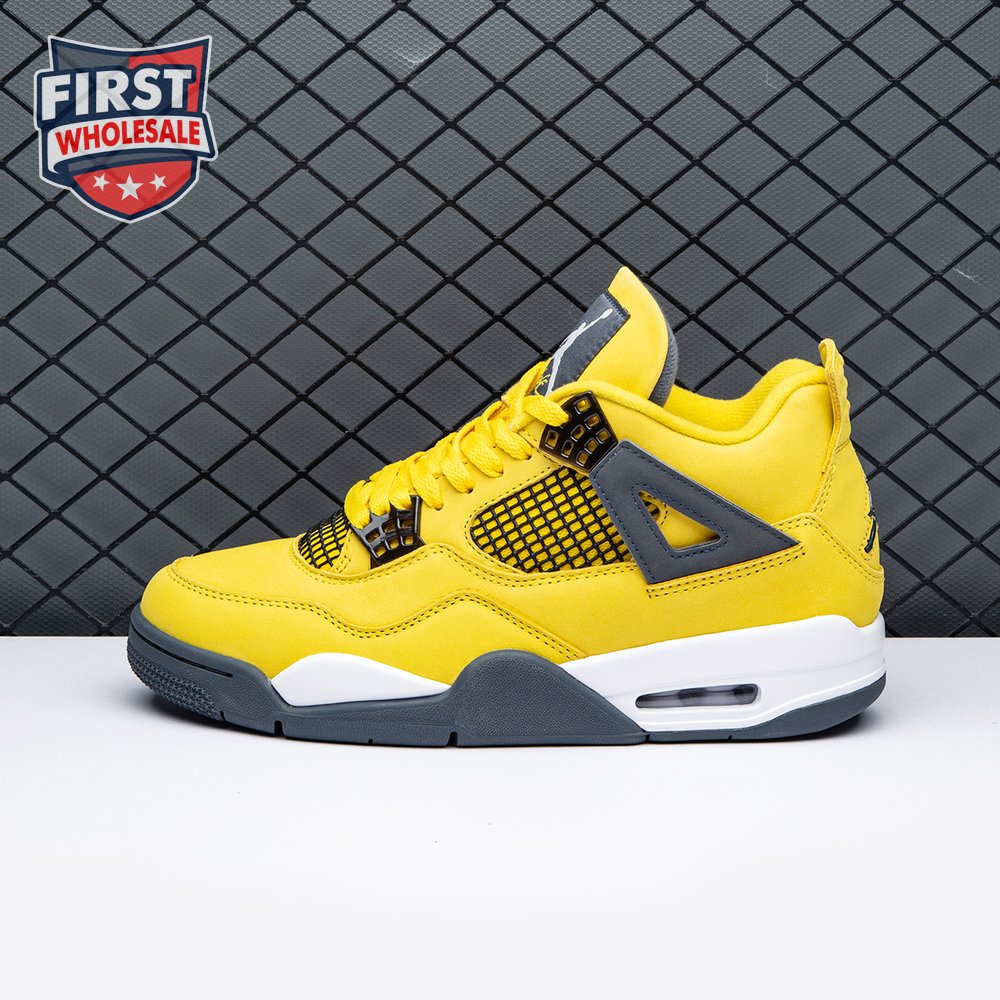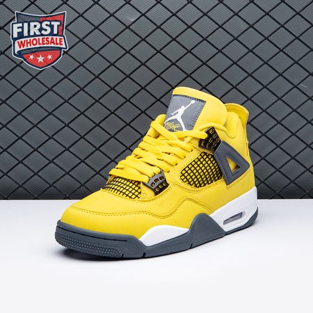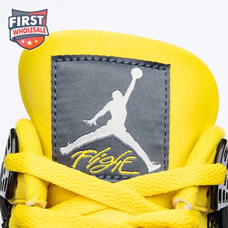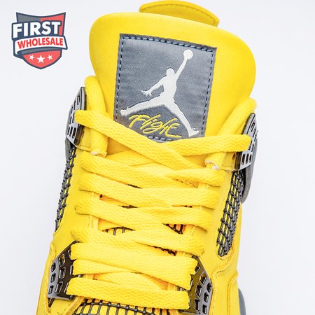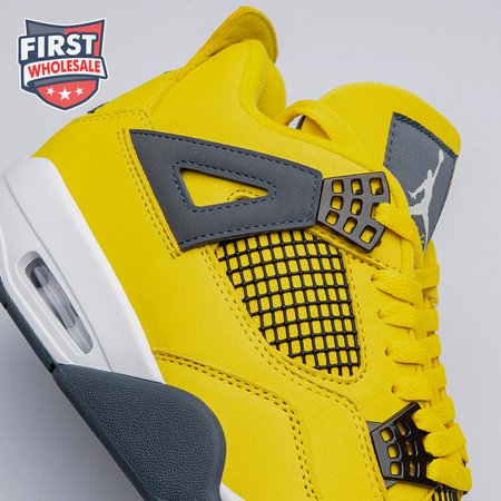 The "Lightning" edition of the Air Jordan 4 took color inspiration from seasonal colors of Michael Jordan"s Motorcycle racing team. The shoe pairs a Tour Yellow nubuck upper with grey detailing on the mesh paneling and lace closure. The "Lightning" was released alongside a "Thunder" colorway which came with a Rare Air jacket, while the "Lightning" color was bundled with a Rare Air t-shirt. You had to be Team Jordan members and sign in to Jumpman23.com to purchase these online exclusives.