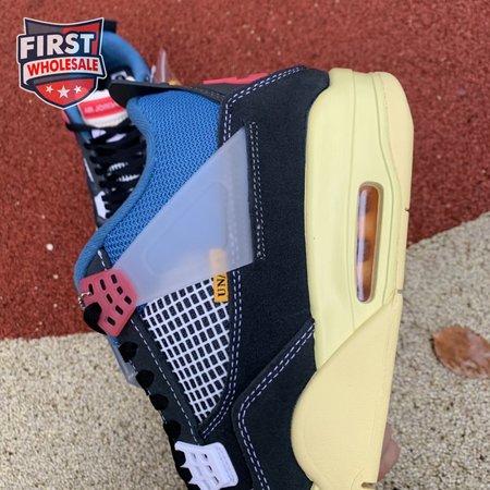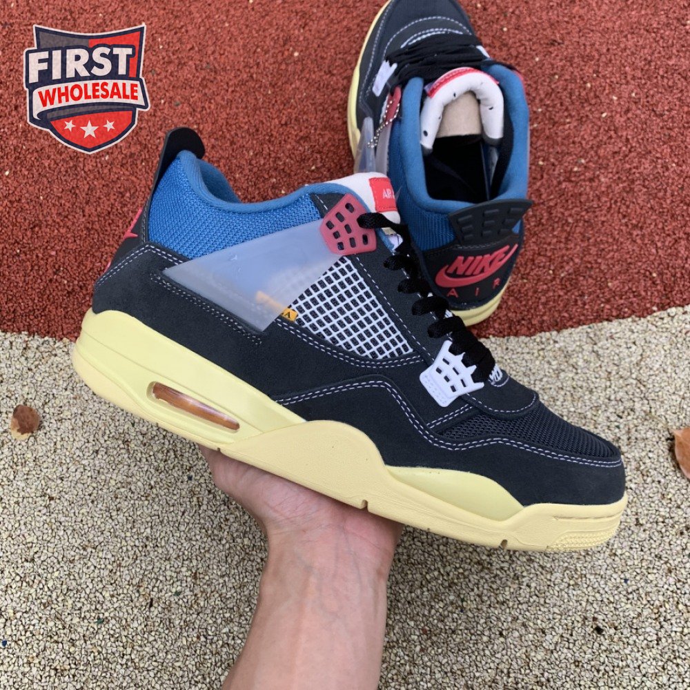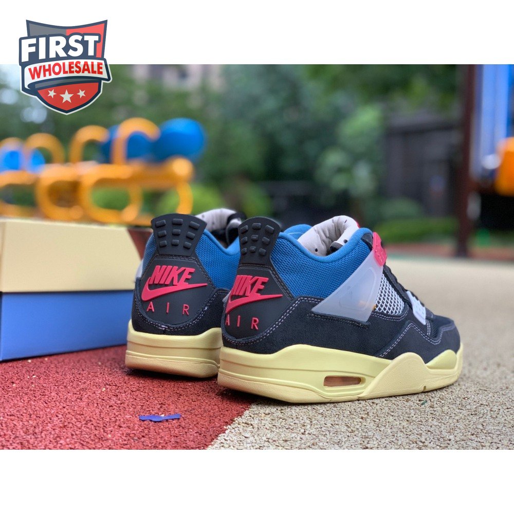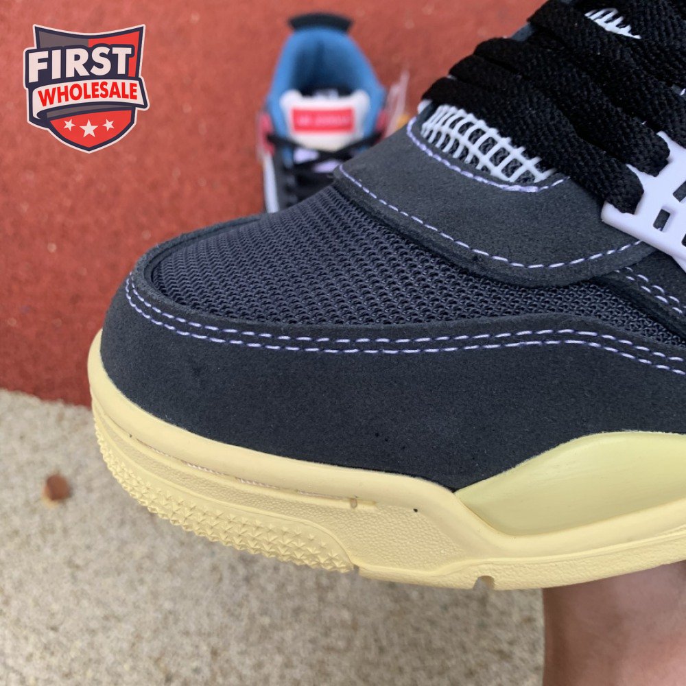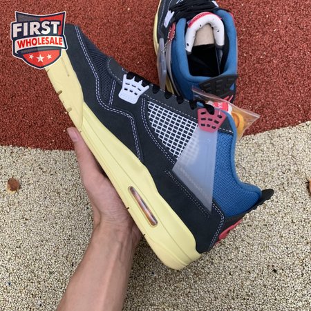 The Union LA x Air Jordan 4 Retro "Off Noir" represents the follow-up effort to the duo"s highly coveted Air Jordan 1 collaboration from 2018. The updated design features a black suede upper with matching black mesh on the toe box and blue mesh around the collar. The semi-translucent structural wings are attached to molded red eyelets, matching the woven Air Jordan tag atop the padded tongue and Nike Air branding on the heel. The TPU wings are filled in, reminiscent of an original Tinker Hatfield sketch of the AJ4, while the AIR JORDAN tag usually found on the inside of the tongue conveys a unique look, like someone folded the tongue over to expose the inside tag. Finally, a 'UN/LA' tag on the side panel shows the Union heritage and a yellowed midsole conveys a vintage aesthetic.
