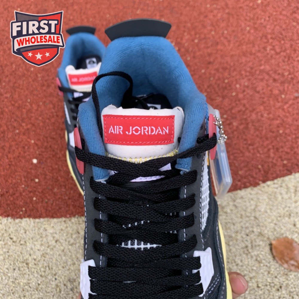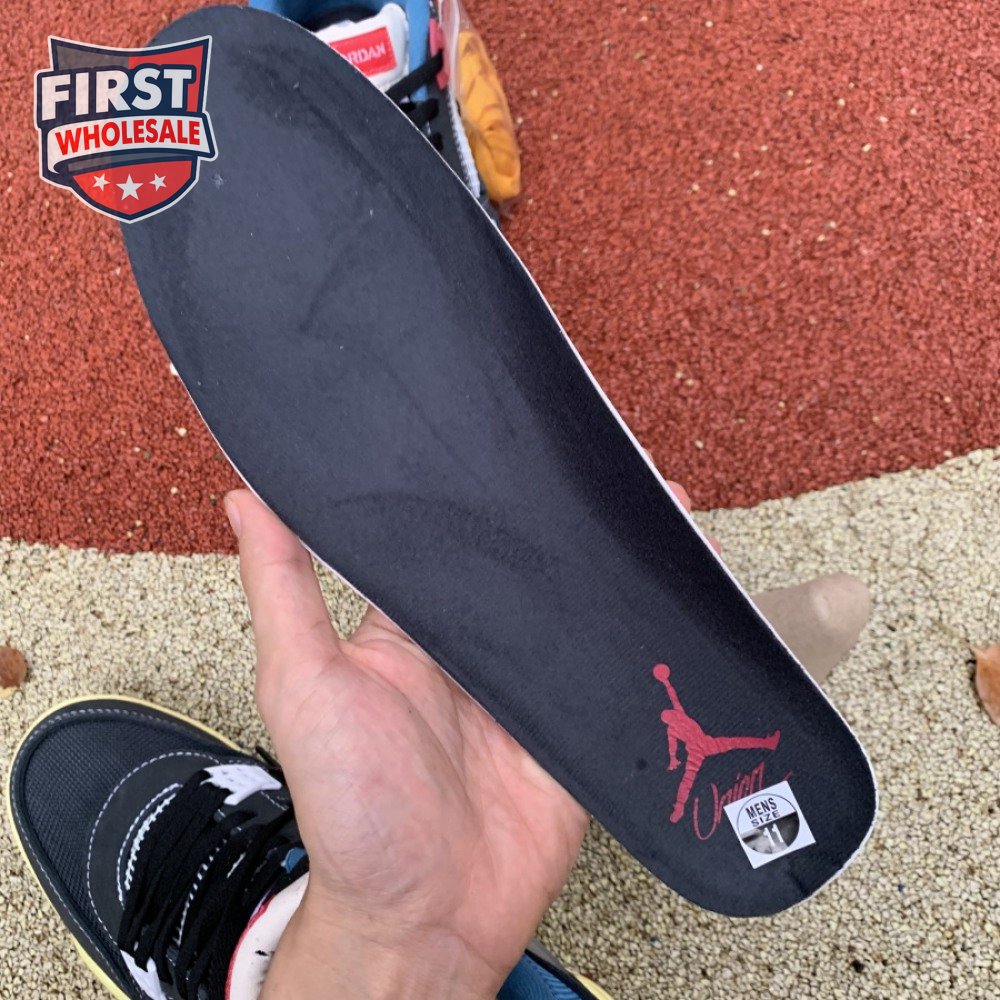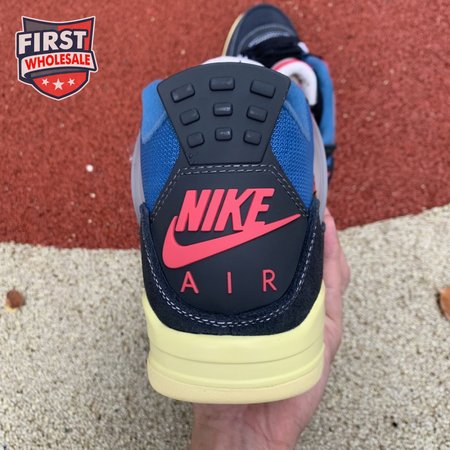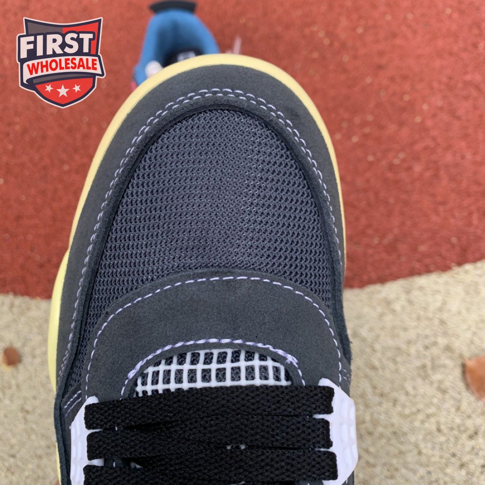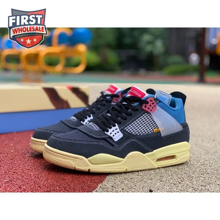 The Union LA x Air Jordan 4 Retro "Off Noir" represents the follow-up effort to the duo"s highly coveted Air Jordan 1 collaboration from 2018. The updated design features a black suede upper with matching black mesh on the toe box and blue mesh around the collar. The semi-translucent structural wings are attached to molded red eyelets, matching the woven Air Jordan tag atop the padded tongue and Nike Air branding on the heel. The TPU wings are filled in, reminiscent of an original Tinker Hatfield sketch of the AJ4, while the AIR JORDAN tag usually found on the inside of the tongue conveys a unique look, like someone folded the tongue over to expose the inside tag. Finally, a 'UN/LA' tag on the side panel shows the Union heritage and a yellowed midsole conveys a vintage aesthetic.