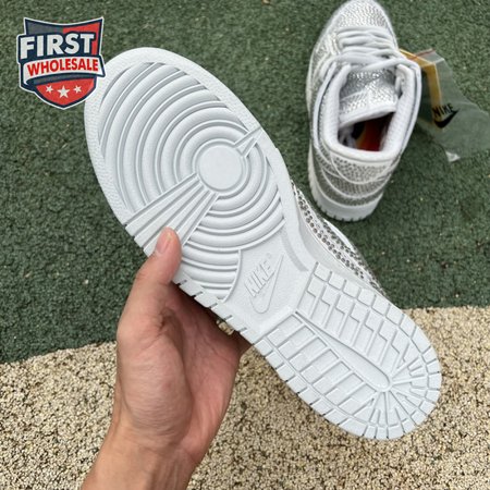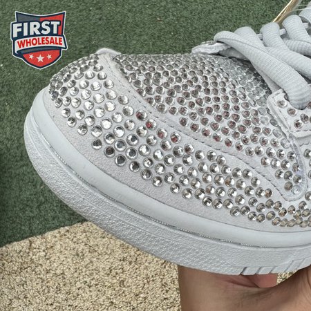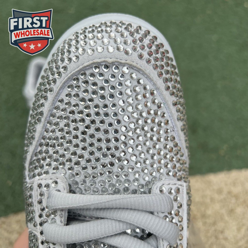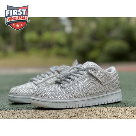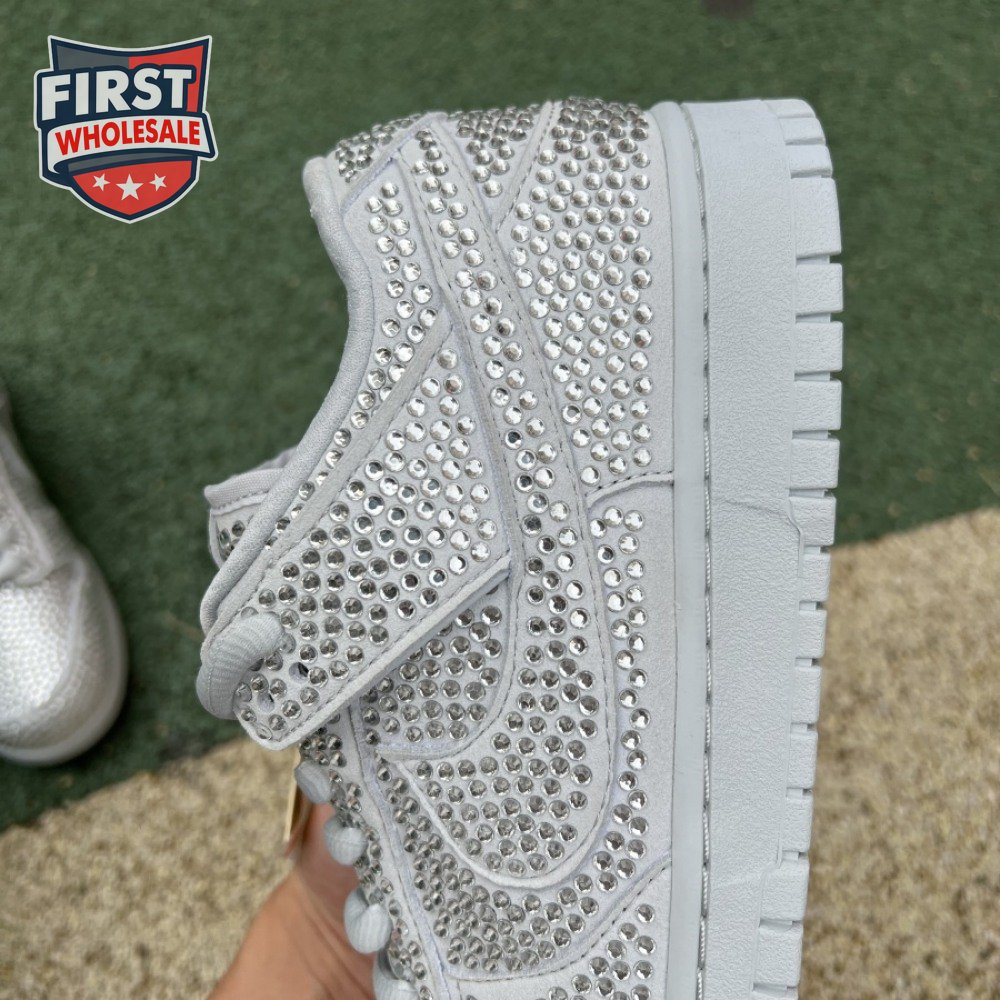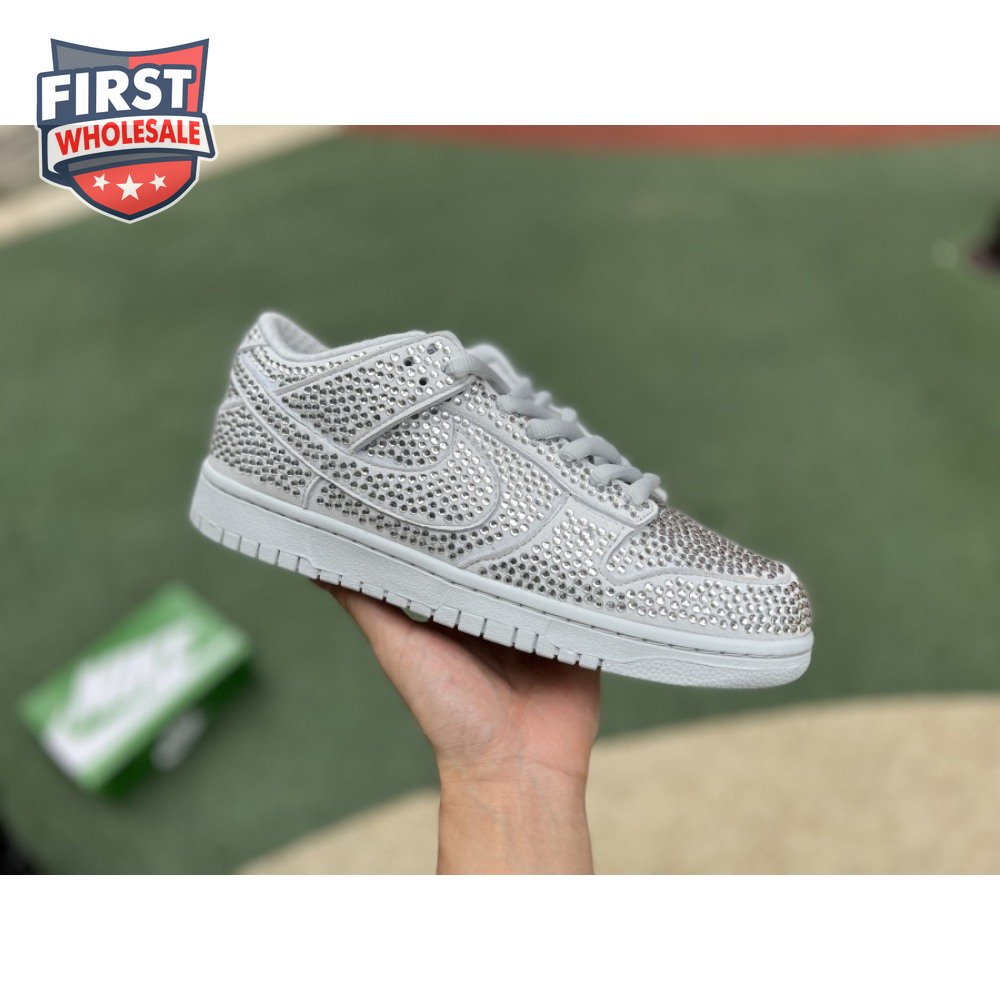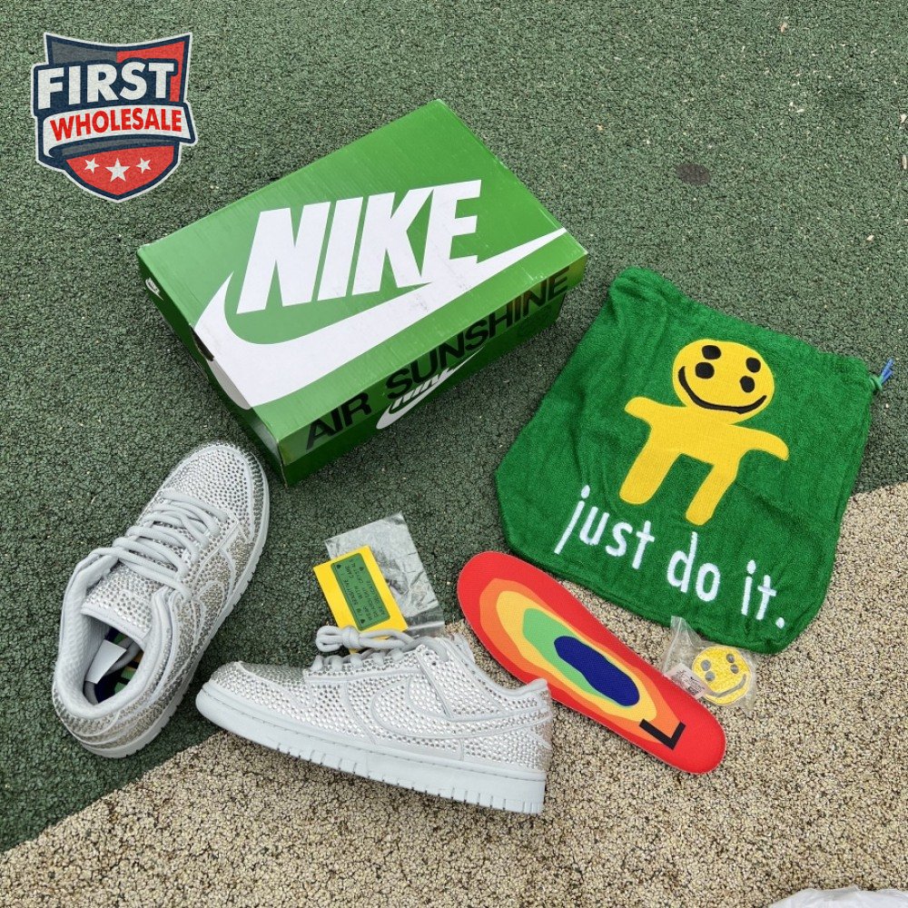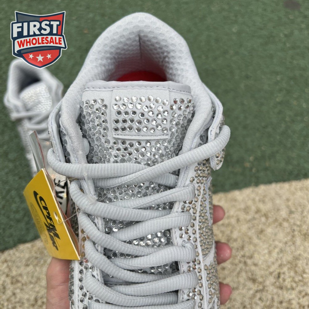 Designed in partnership with the LA-based streetwear brand, the Cactus Plant Flea Market x Swarovski x Nike Dunk Low "Pure Platinum" delivers an opulent take on the classic silhouette. Every inch of the suede upper is entirely covered in Swarovski crystals, including the detachable double lace flaps, heavily padded tongue and oversized Swoosh, the latter borrowed from CPFM"s previous Nike Blazer collaboration from 2019.