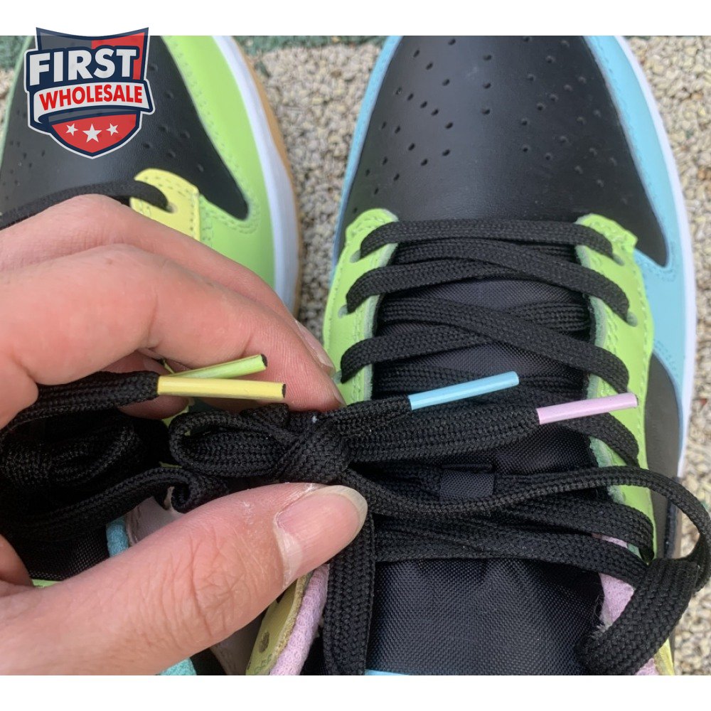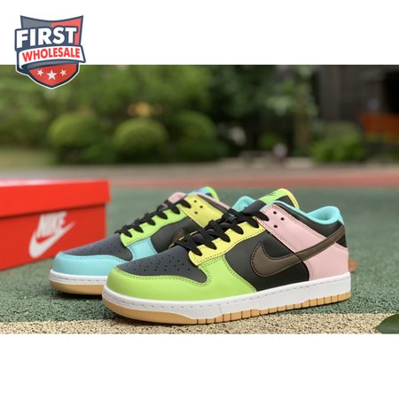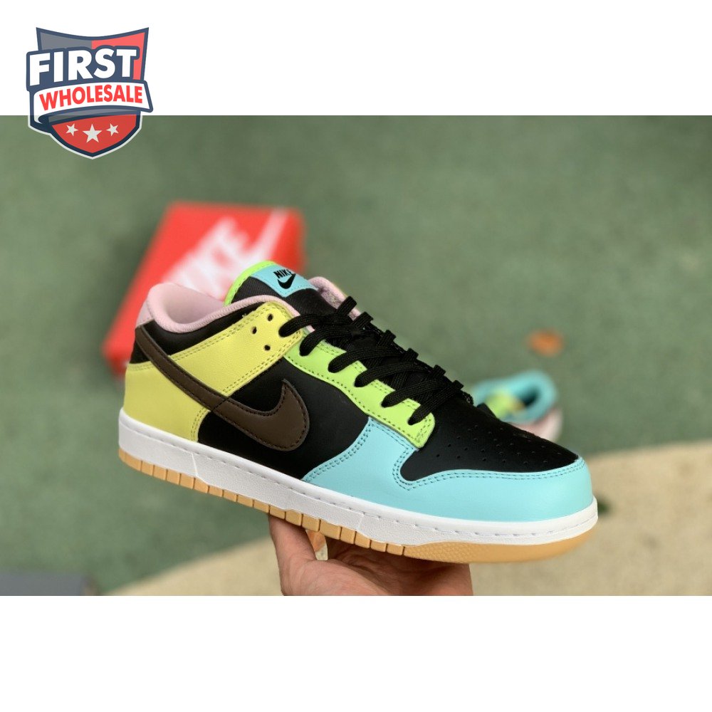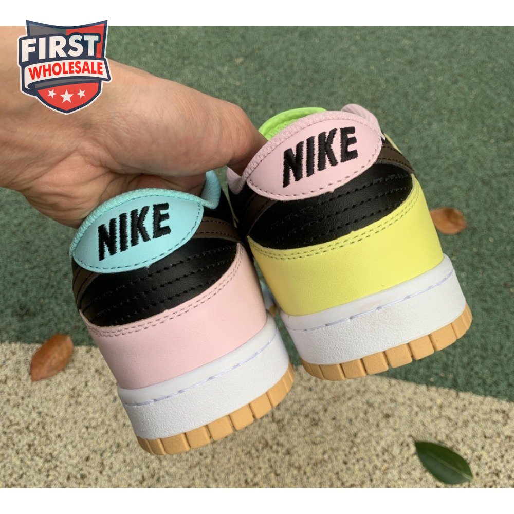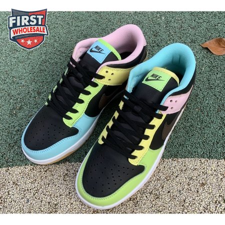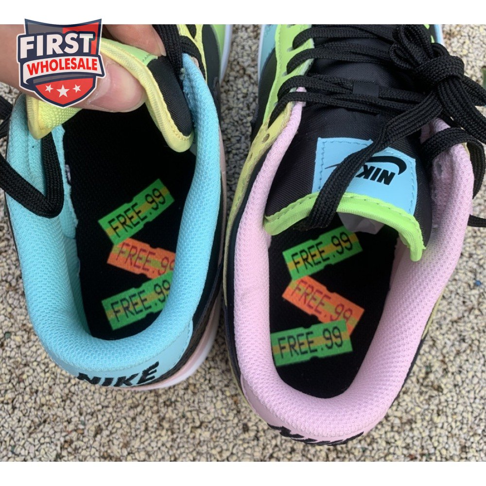 The Nike Dunk Low SE "Free.99 - Black" applies mismatched color blocking to the vintage hoops shoe turned streetwear staple. Both the left and right shoe feature a black leather base on the upper, supported by a crisp white midsole and pale orange rubber outsole. While the overlays on each shoe are arranged in asymmetrical fashion, they draw from the pastel palette of powder blue, pink, yellow and line green hues. The custom sockliner displays "Free.99" price stickers.