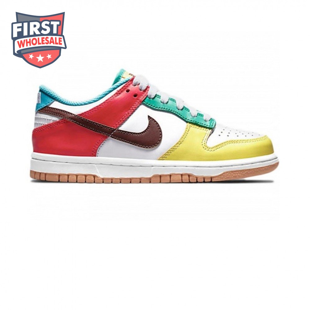 The Nike Dunk Low SE "Free.99 - Black" applies mismatched color blocking to the vintage hoops shoe turned streetwear staple. Both the left and right shoe feature a black leather base on the upper, supported by a crisp white midsole and pale orange rubber outsole. While the overlays on each shoe are arranged in asymmetrical fashion, they draw from the pastel palette of powder blue, pink, yellow and line green hues. The custom sockliner displays "Free.99" price stickers.