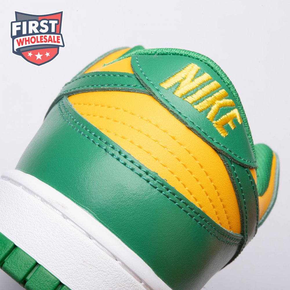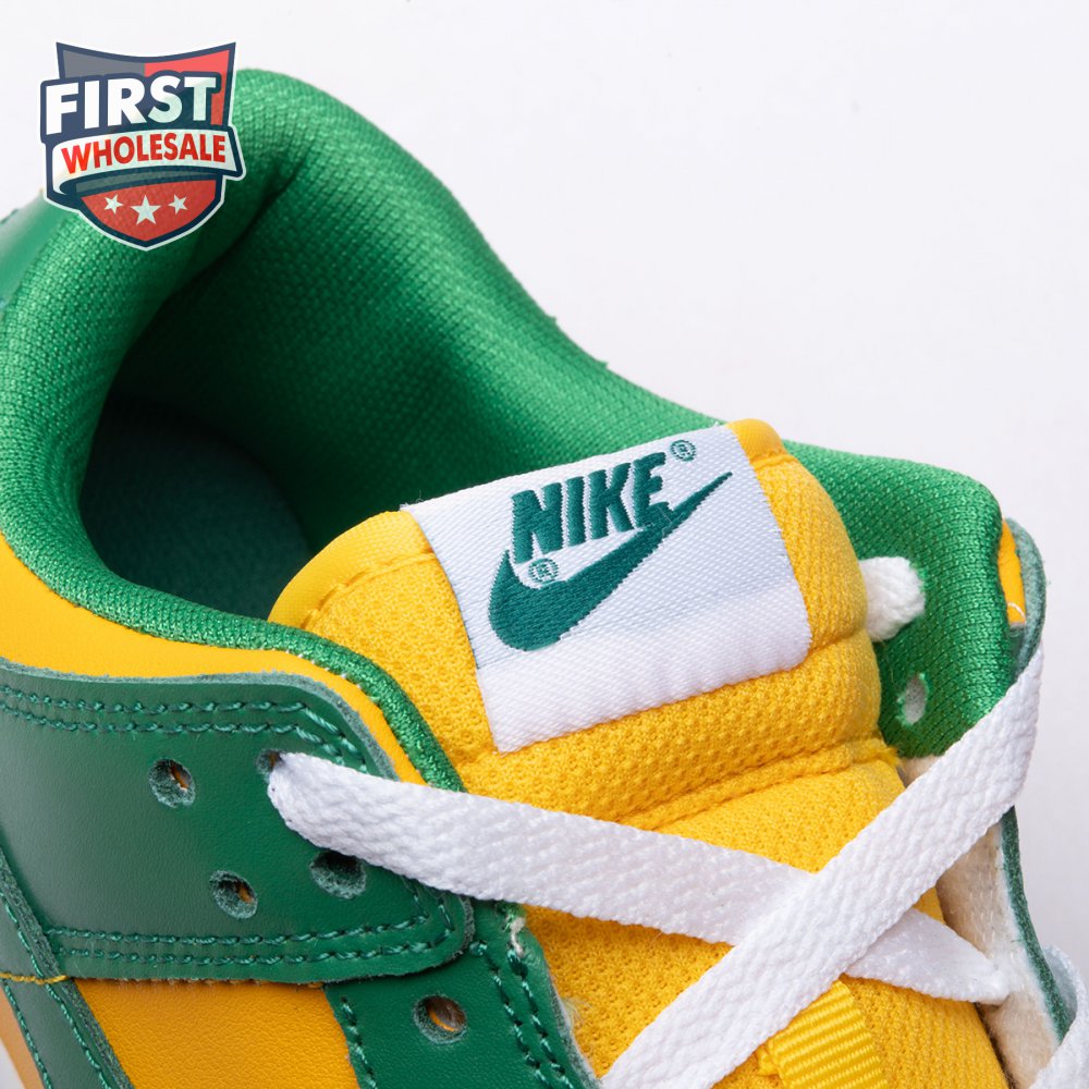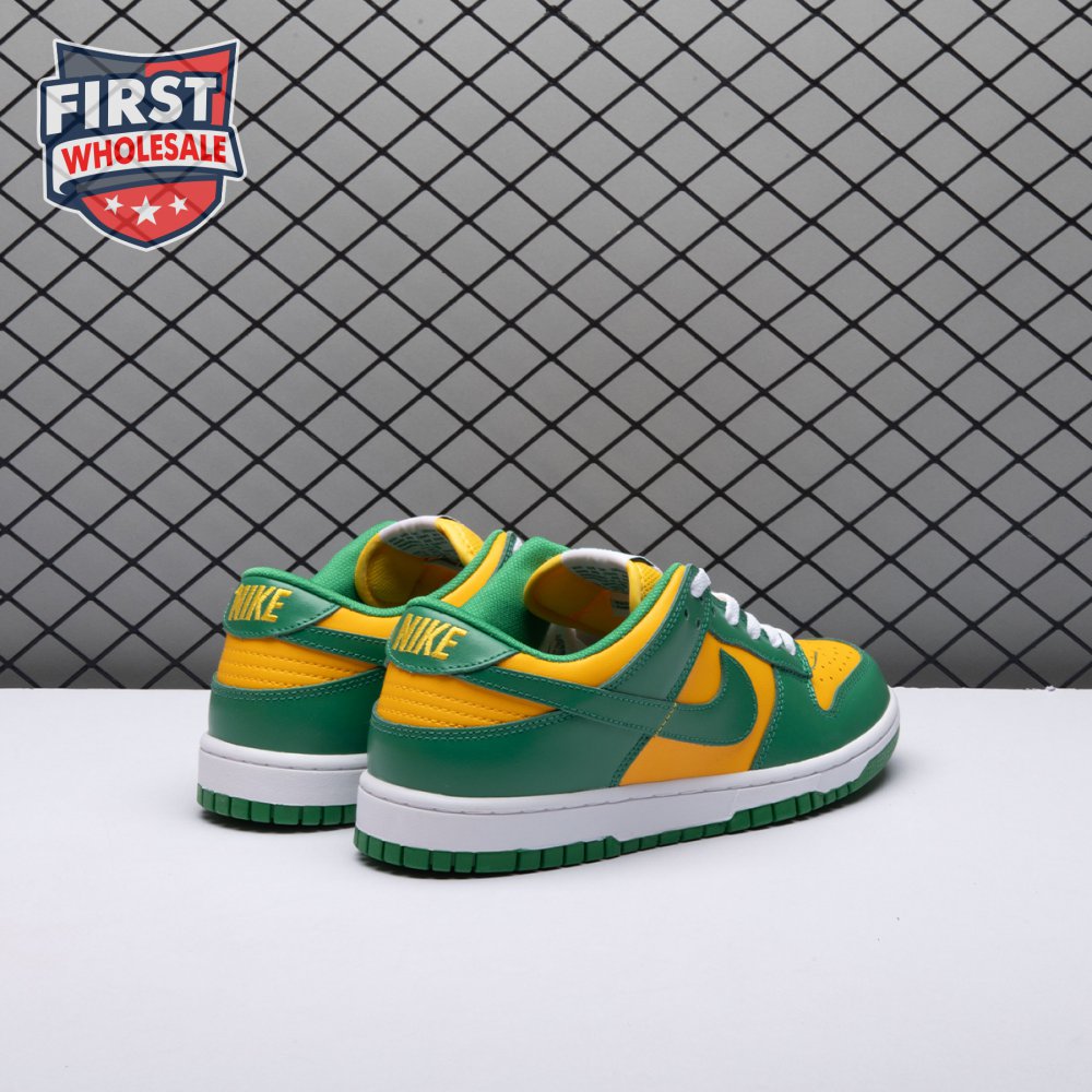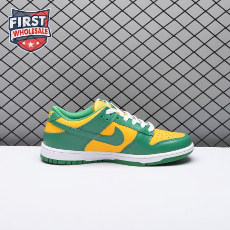 The Nike Dunk Low SP "Brazil" replicates the look of the classic "Brazil" Dunk from 2001, featuring a simple two-tone color scheme that combines a yellow leather base with contrasting green overlays. Nike branding adorns the heel tab and stitched-on woven tag atop the lightly padded nylon tongue. The low-profile silhouette is mounted on a sturdy white foam midsole, reinforced underfoot by a green rubber outsole.