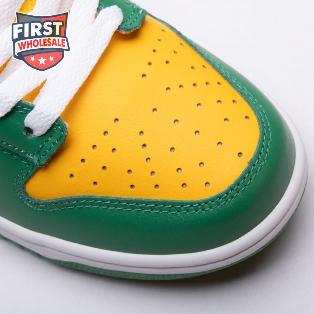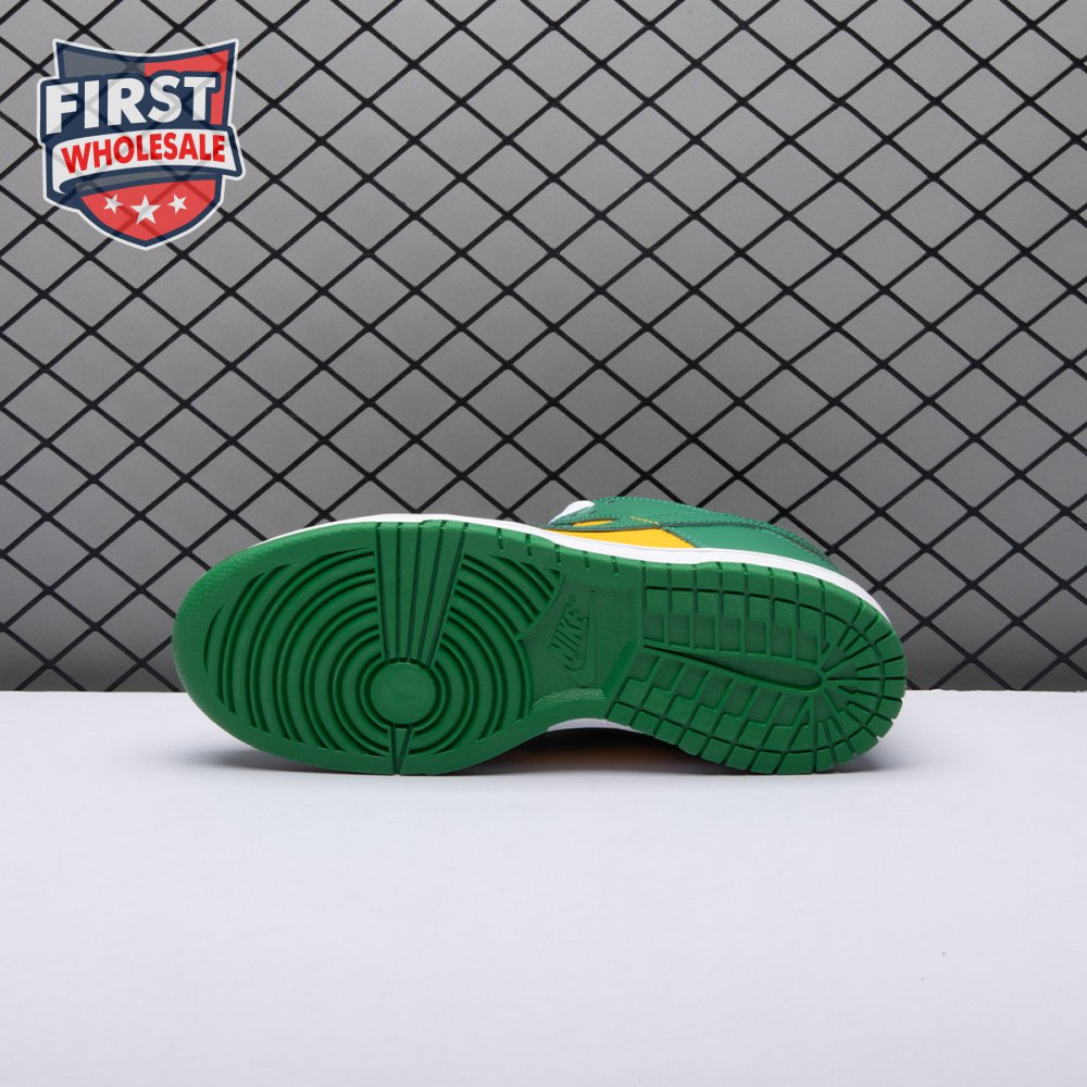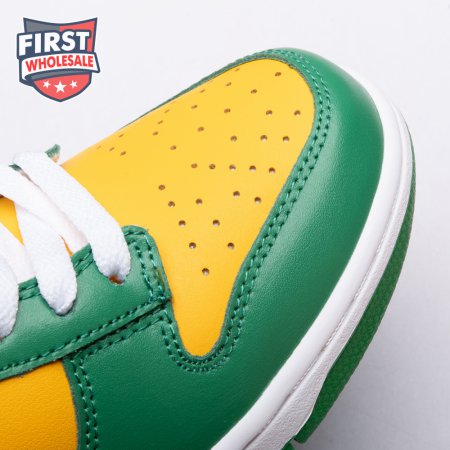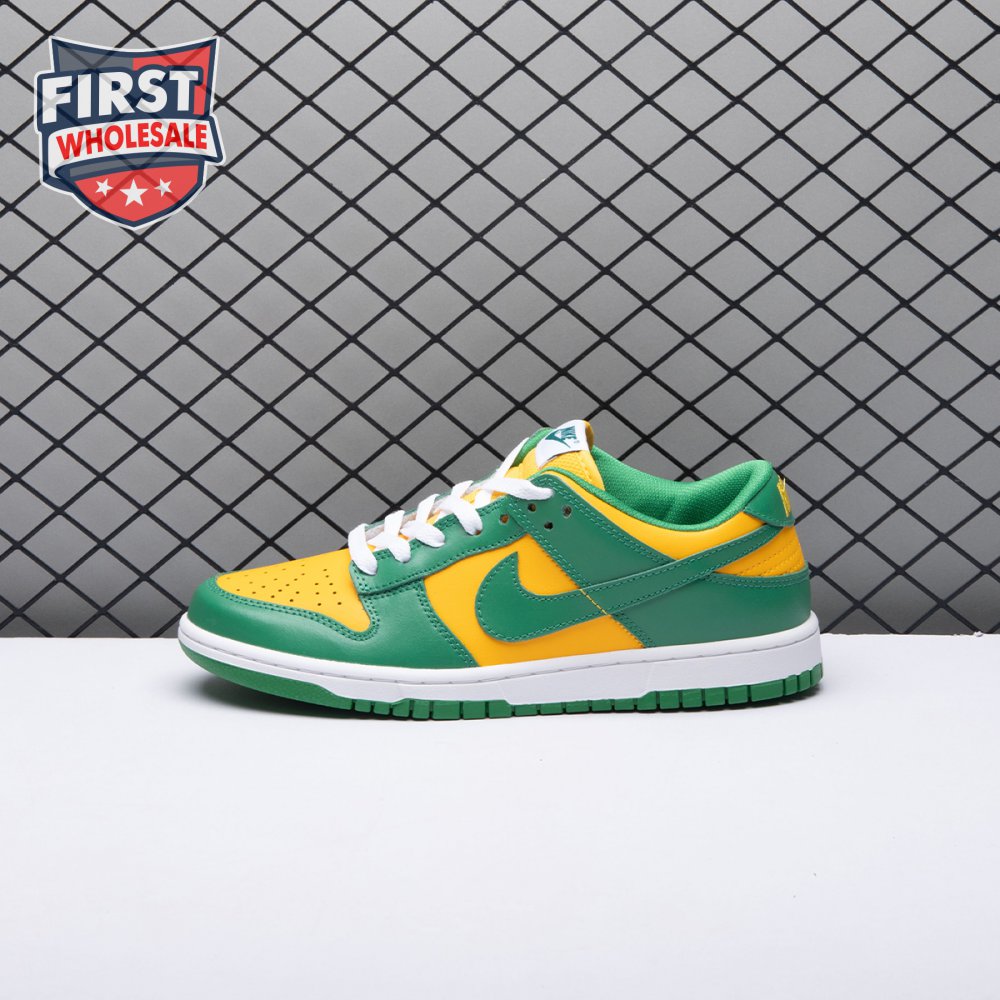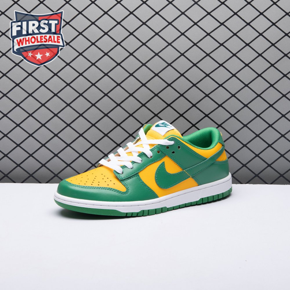 The Nike Dunk Low SP "Brazil" replicates the look of the classic "Brazil" Dunk from 2001, featuring a simple two-tone color scheme that combines a yellow leather base with contrasting green overlays. Nike branding adorns the heel tab and stitched-on woven tag atop the lightly padded nylon tongue. The low-profile silhouette is mounted on a sturdy white foam midsole, reinforced underfoot by a green rubber outsole.