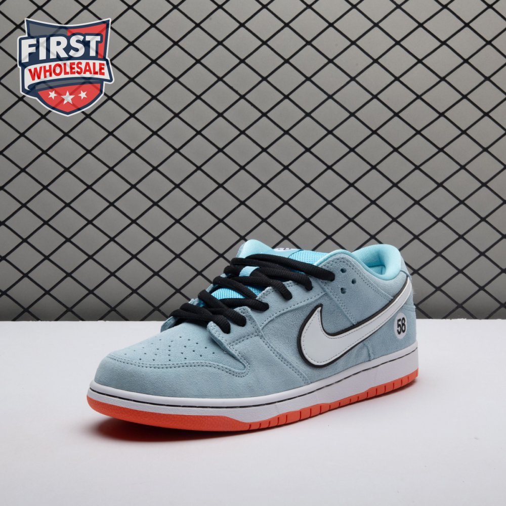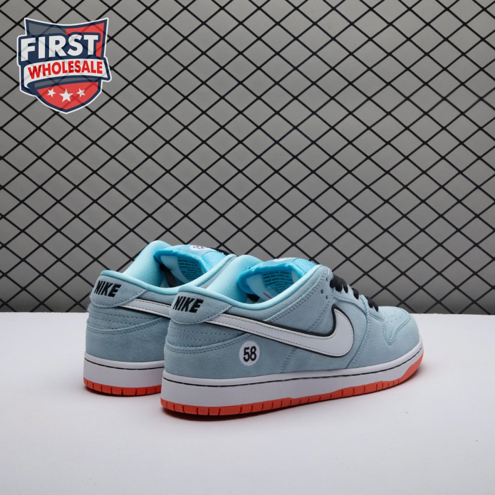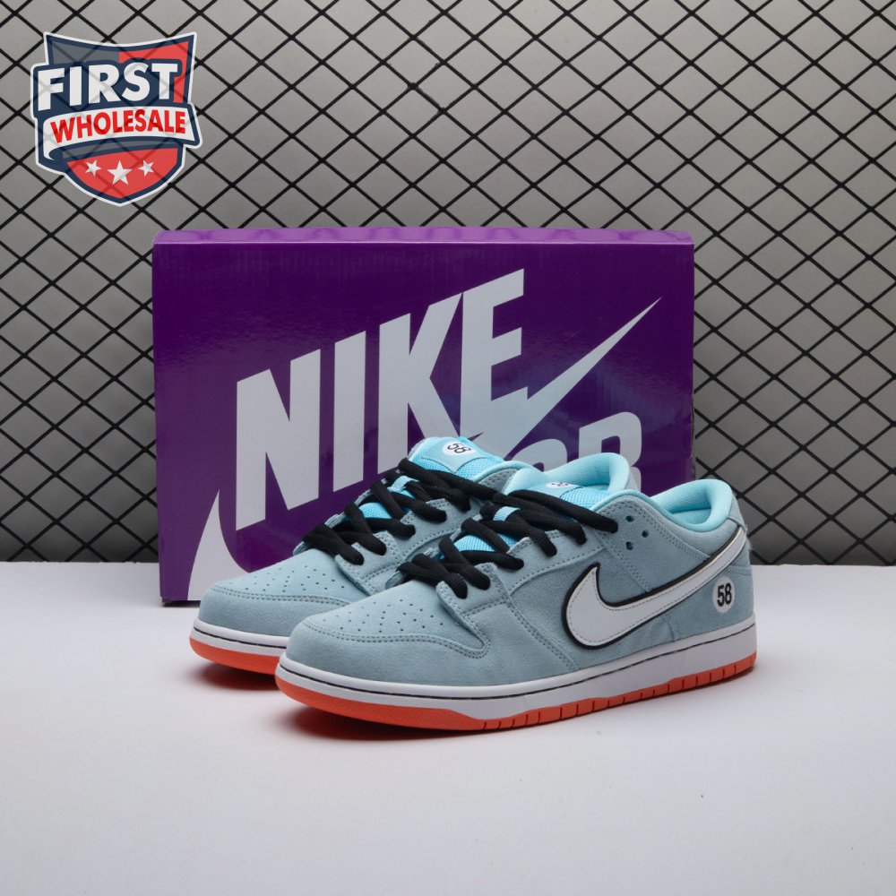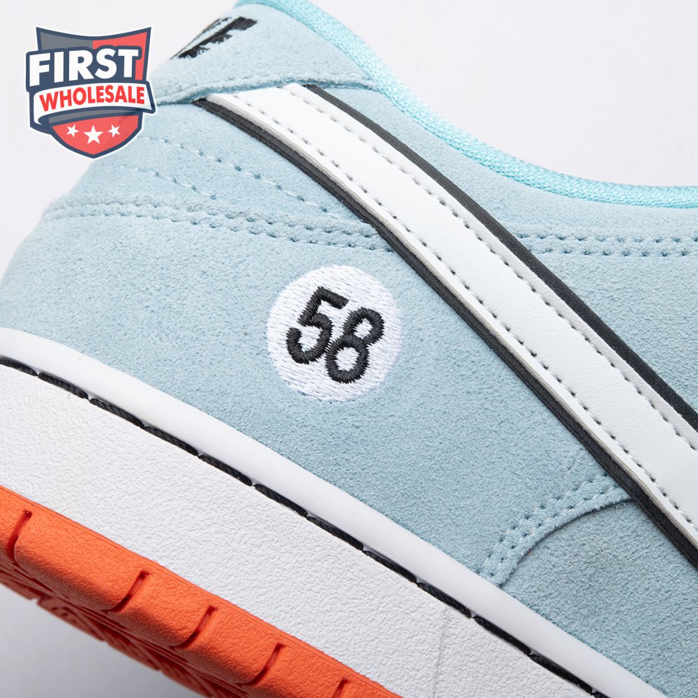 The Nike Dunk Low Pro SB 'Gulf" is the follow-up to the Blazer Mid "Club 58" from 2018, both of which are designed in collaboration with a consortium of four prominent skate shops located in Western Europe. Light blue suede is utilized throughout the upper, accented with a white leather Swoosh and a circular 58 graphic on the lateral heel. The digits are repeated on the woven tag affixed to the stuffed mesh tongue. Underfoot, a bright orange rubber outsole delivers a contrasting pop of color.