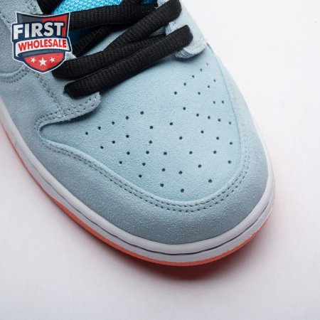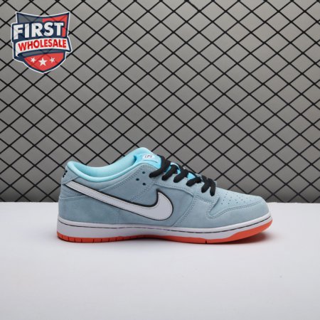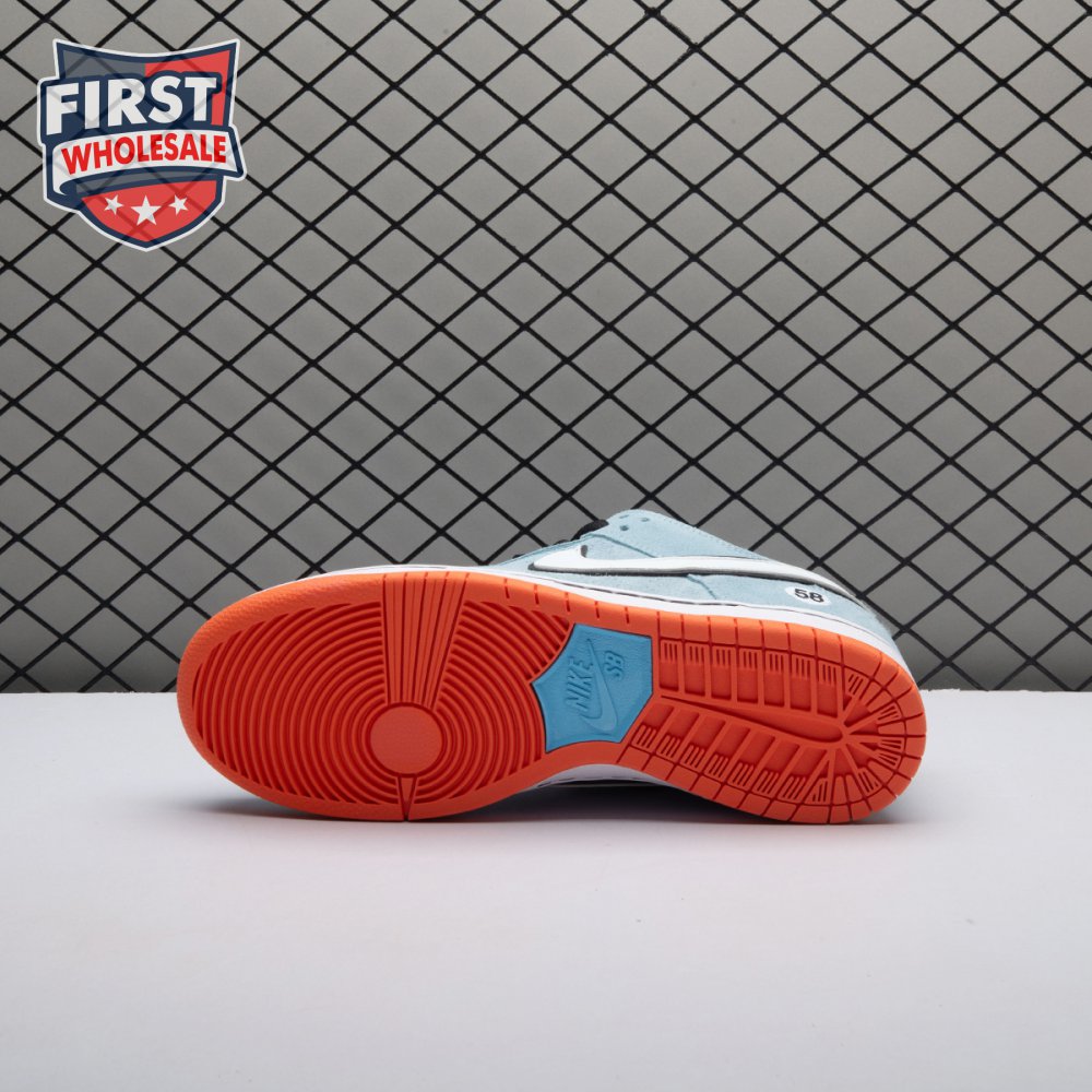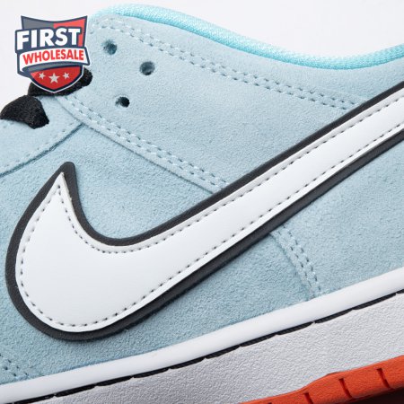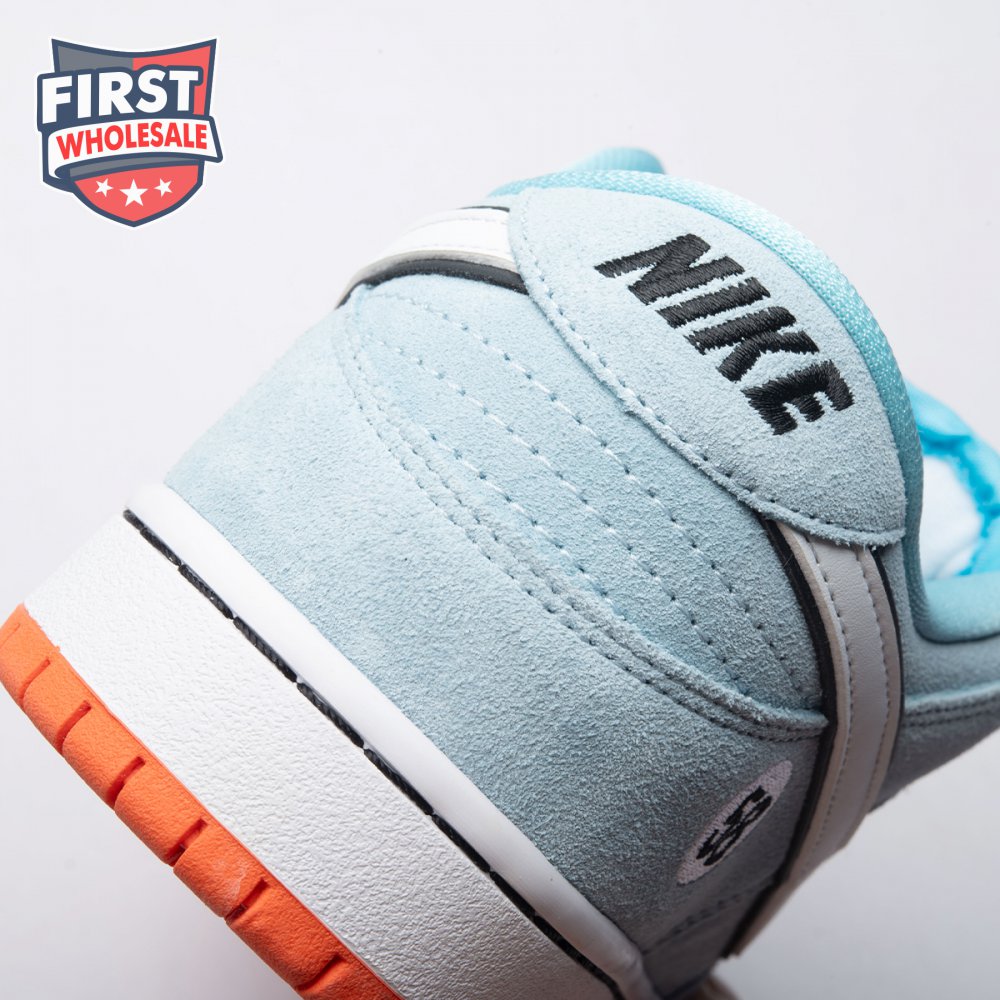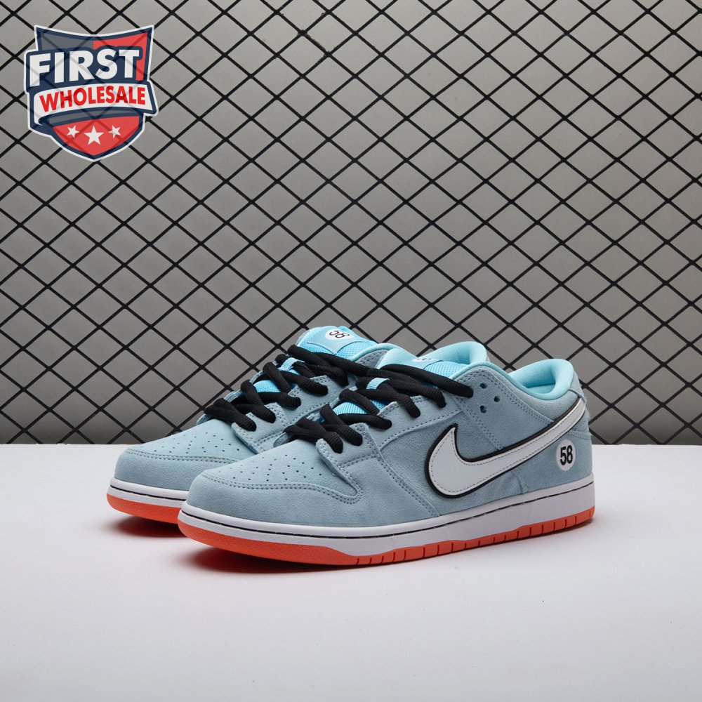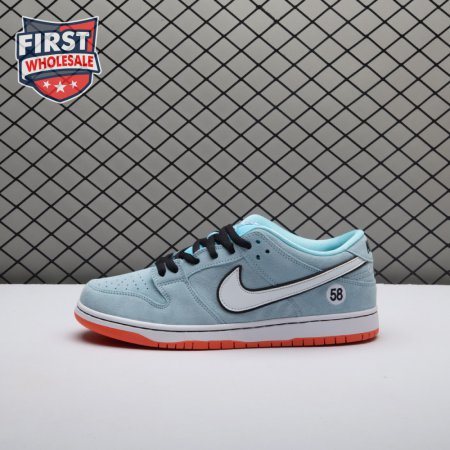 The Nike Dunk Low Pro SB 'Gulf" is the follow-up to the Blazer Mid "Club 58" from 2018, both of which are designed in collaboration with a consortium of four prominent skate shops located in Western Europe. Light blue suede is utilized throughout the upper, accented with a white leather Swoosh and a circular 58 graphic on the lateral heel. The digits are repeated on the woven tag affixed to the stuffed mesh tongue. Underfoot, a bright orange rubber outsole delivers a contrasting pop of color.