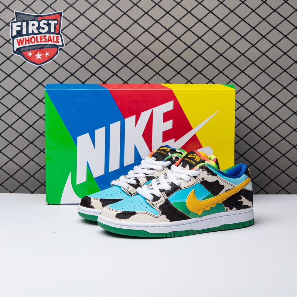 Made in collaboration with Ben & Jerry"s, the Nike Dunk Low SB "Chunky Dunky" replicates the packaging used for the ice cream brand"s Chunky Monkey flavor. The leather upper depicts blue skies and green pastures, while pony-hair overlays are rendered in a spotted cow print. A yellow leather Swoosh is treated to a melting ice cream effect for added visual flair. Atop the tongue, the woven tag features a Chunky Dunky callout alongside Nike SB branding.