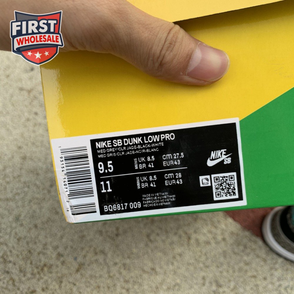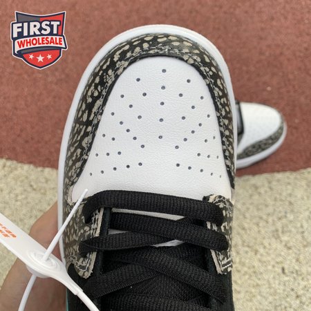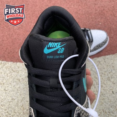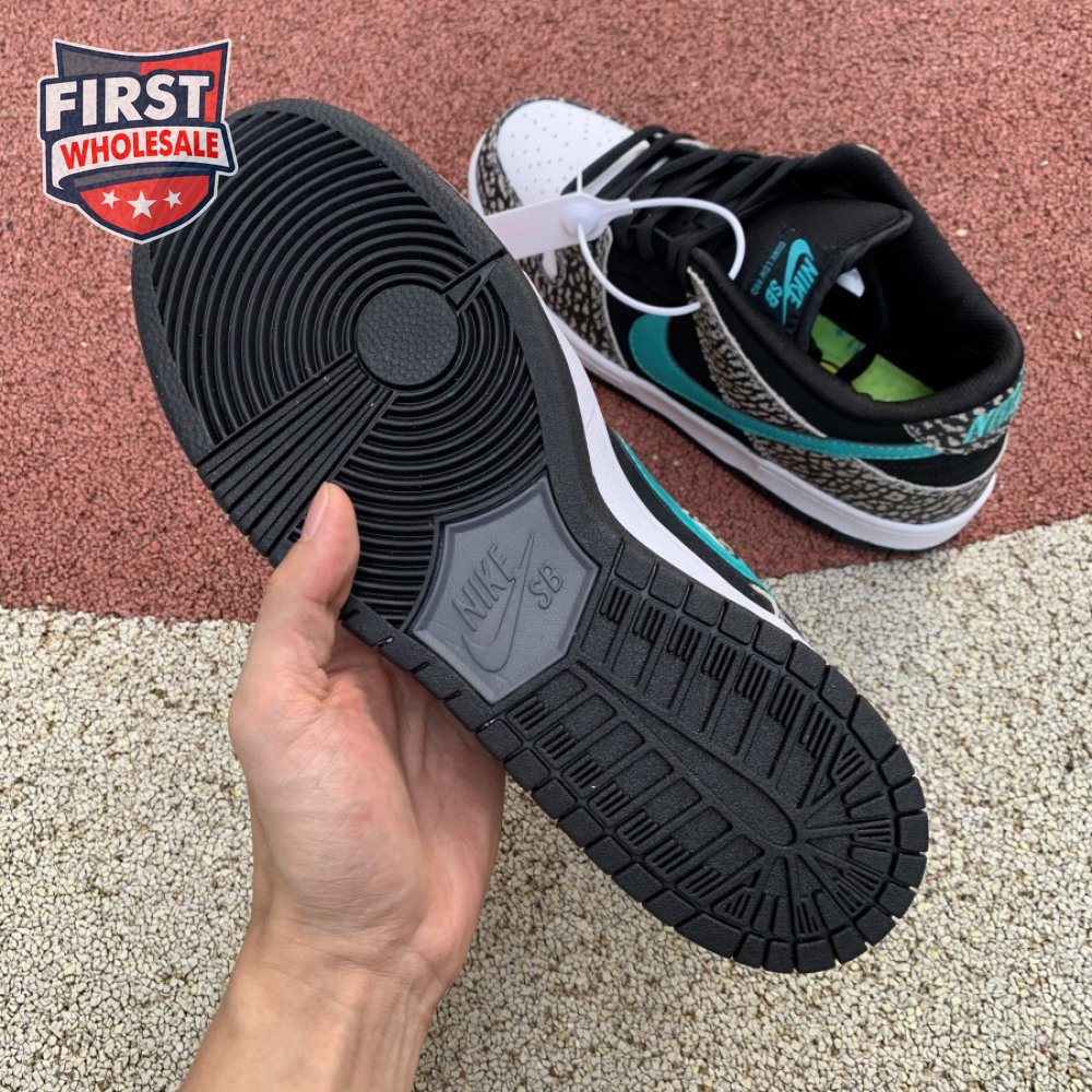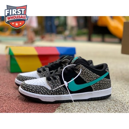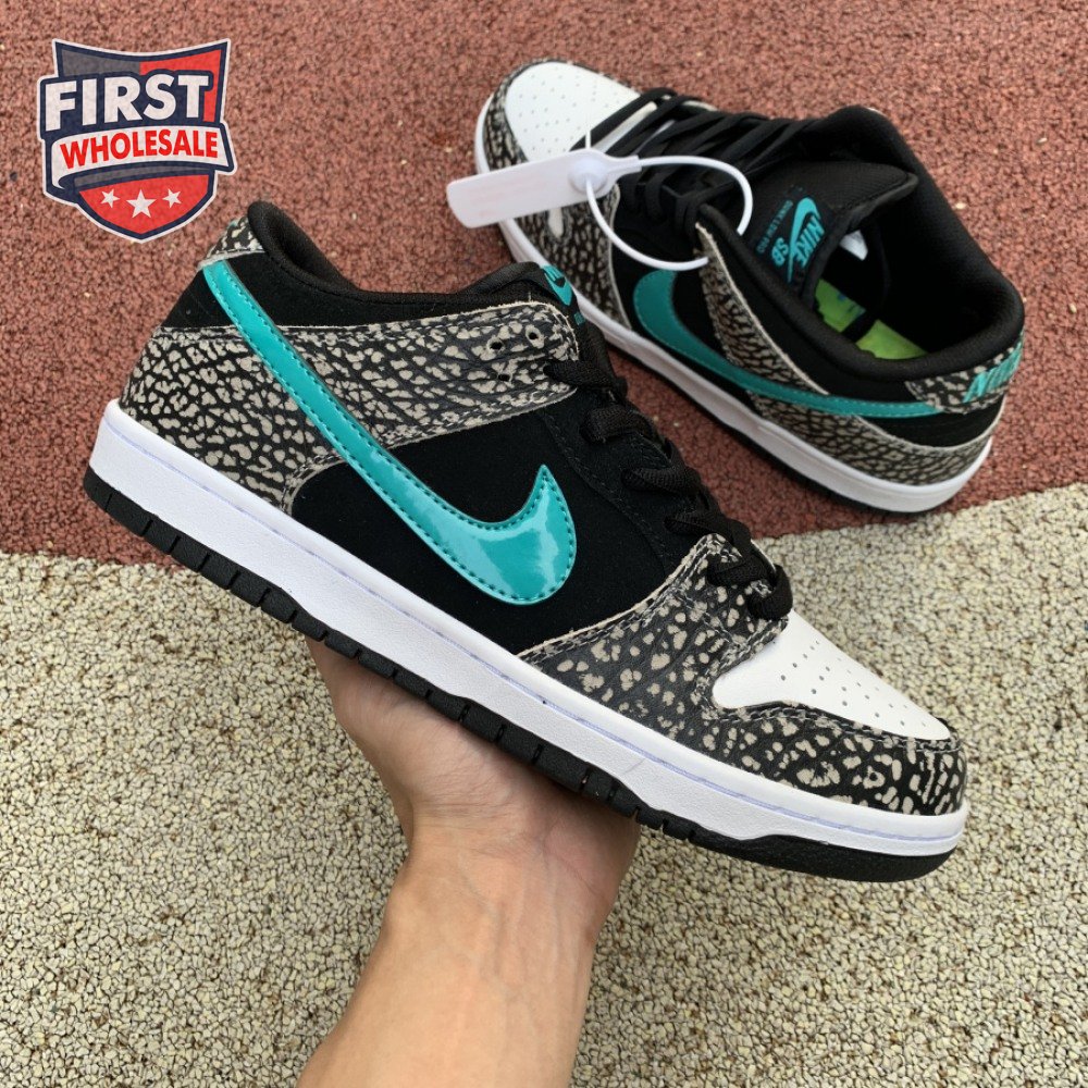 The Nike Dunk Low Pro SB "Atmos Elephant" showcases a familiar design reminiscent of Atmos" highly coveted Air Max 1 collaboration, originally released in 2006 and reissued in 2017. The low-top features a perforated white leather toe box, black suede quarter panel and grey elephant-print overlays along the forefoot and heel. The signature Swoosh stands out in Clear Jade, matching Nike branding hits at the heel tab and woven tongue tag.
