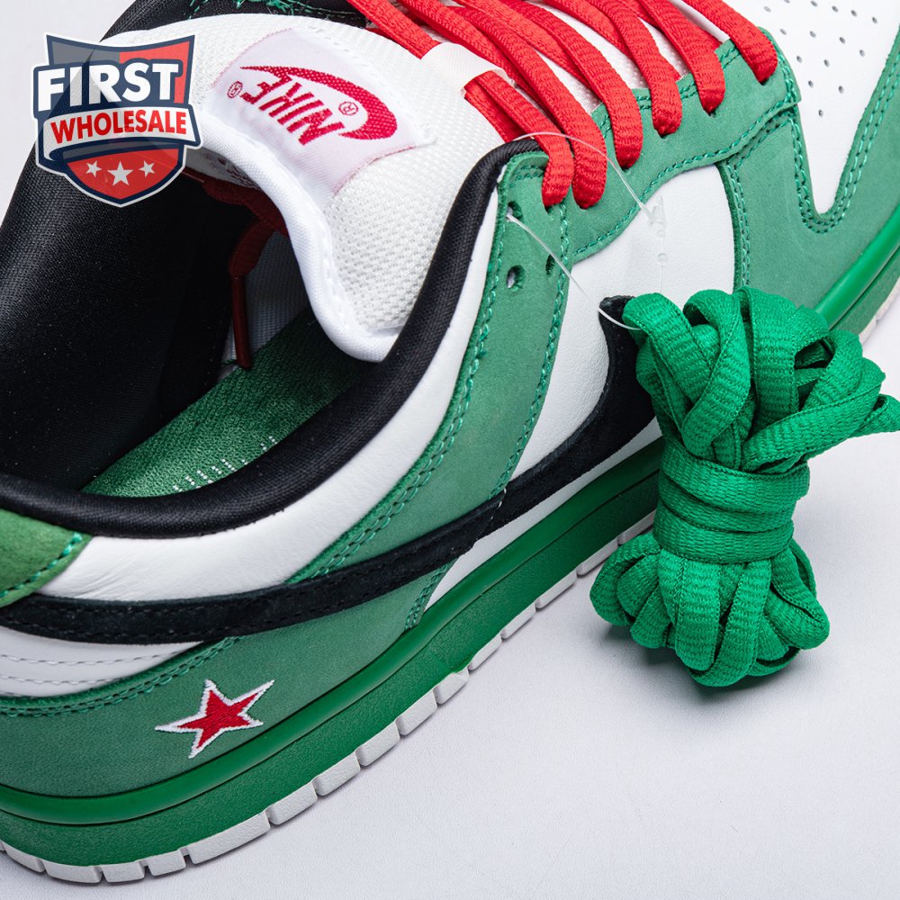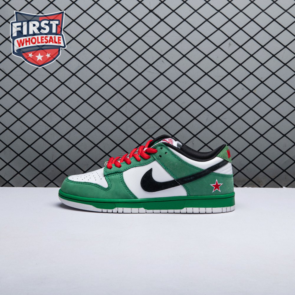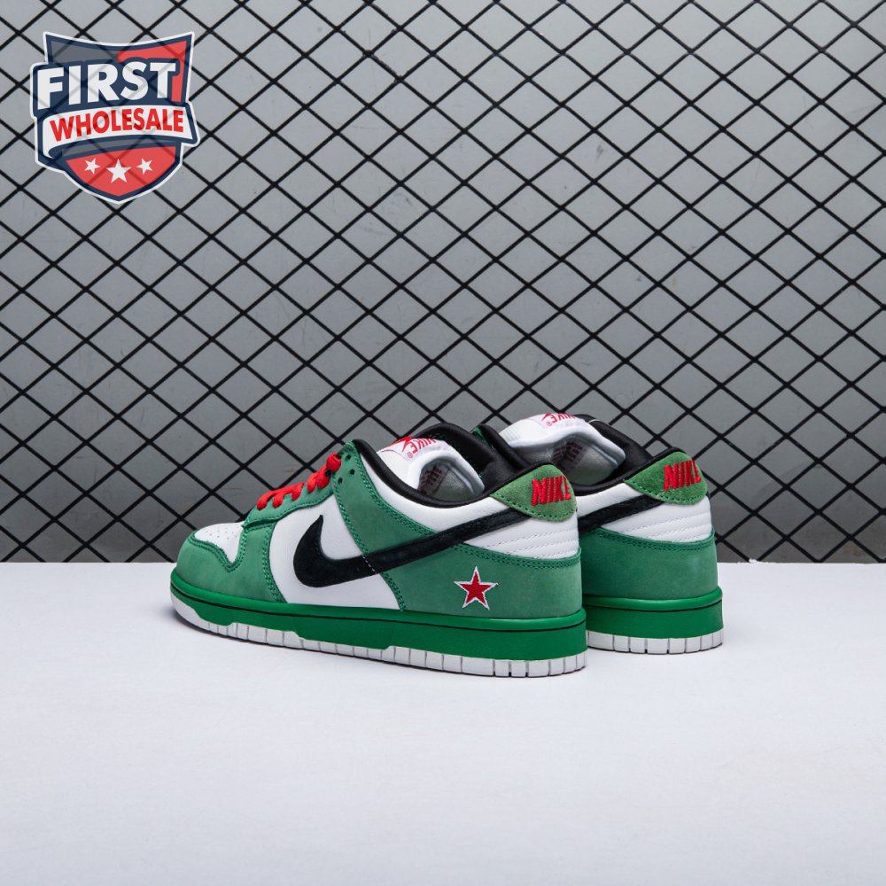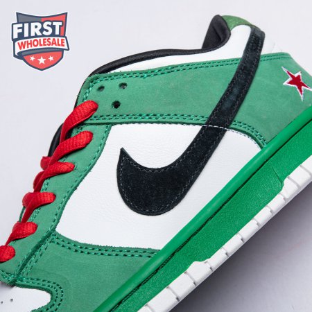 The Dunk Low Pro SB "Heineken" takes inspiration from the signature green bottles used by the Dutch beer brand. The low-top sports a white leather upper with green nubuck overlays and a black suede Swoosh. The color scheme up top is repeated on the shoe"s tooling, featuring a green midsole and crisp white outsole. Bordered in white, an embroidered red star graces the lateral heel.
