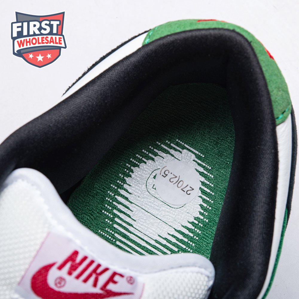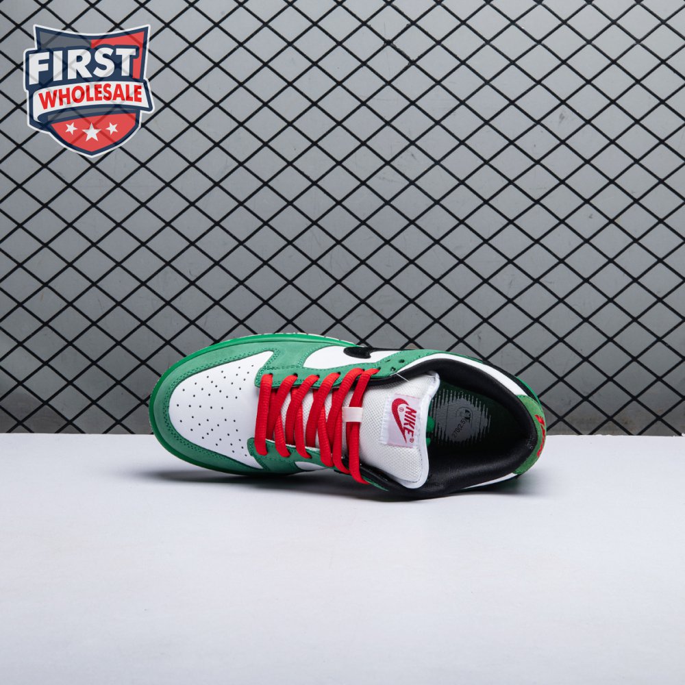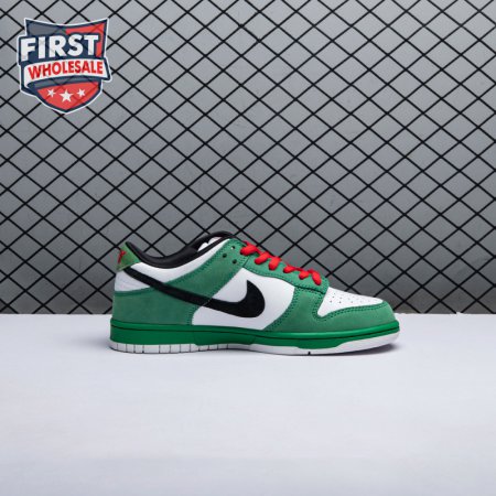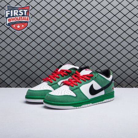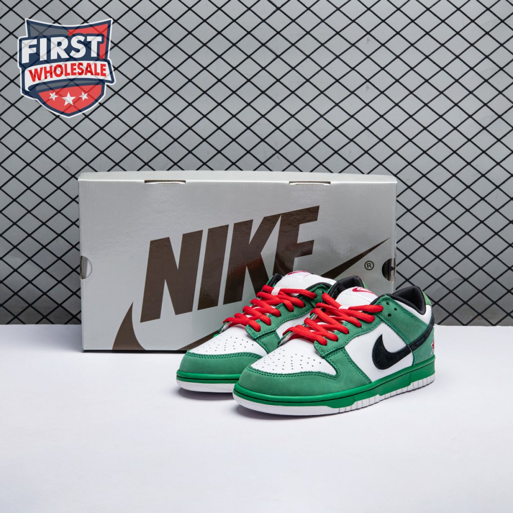 The Dunk Low Pro SB "Heineken" takes inspiration from the signature green bottles used by the Dutch beer brand. The low-top sports a white leather upper with green nubuck overlays and a black suede Swoosh. The color scheme up top is repeated on the shoe"s tooling, featuring a green midsole and crisp white outsole. Bordered in white, an embroidered red star graces the lateral heel.
