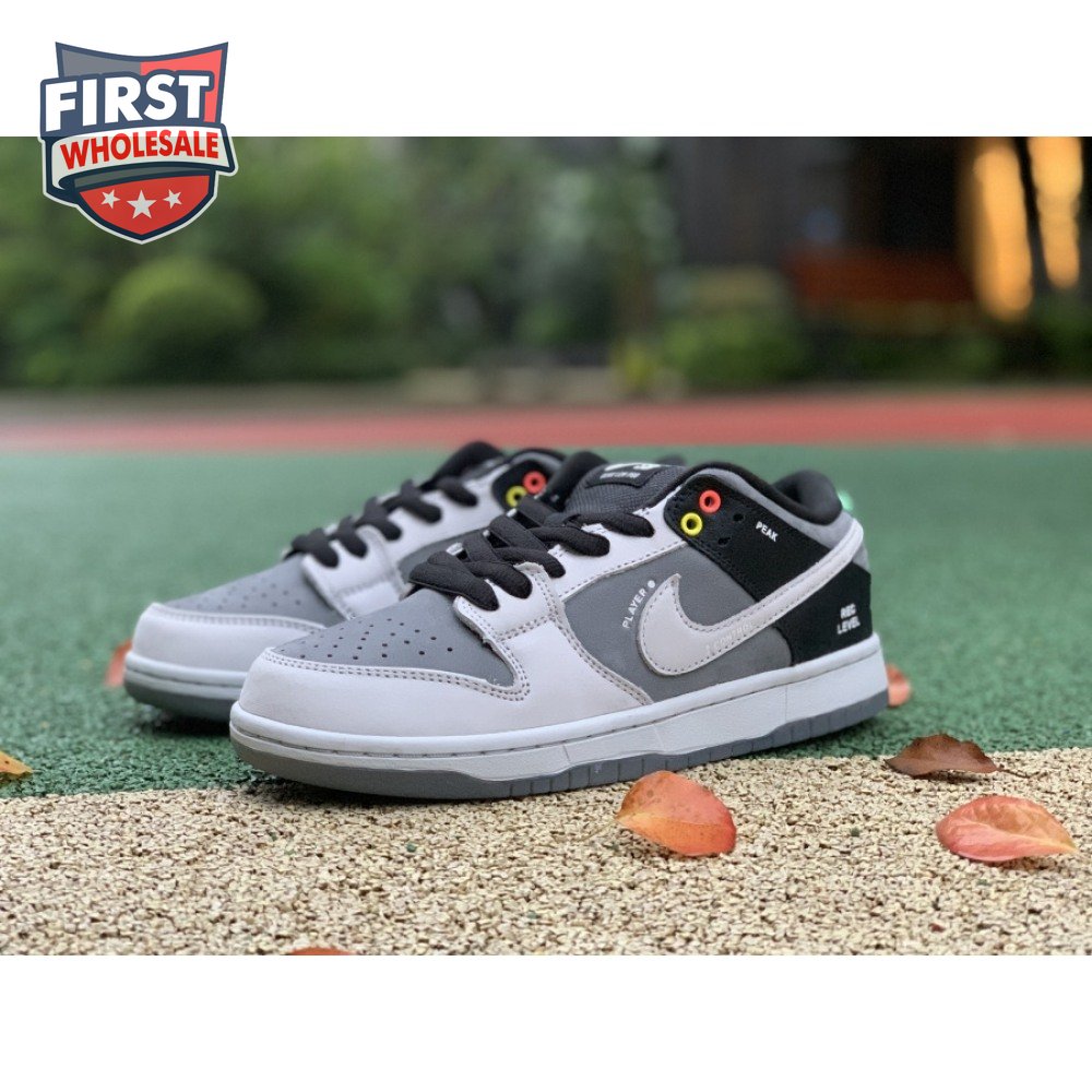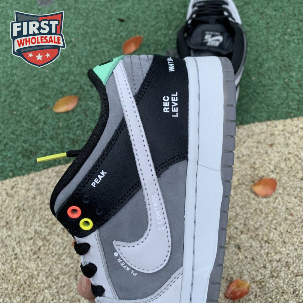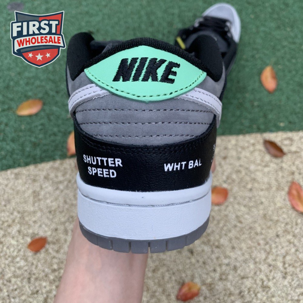 The Nike Dunk Low SB "Camcorder" takes inspiration from an iconic piece of equipment that was instrumental in the proliferation of skate videos in the "90s: the Sony DCR VX1000 camcorder. The low-top makes use of a charcoal nubuck upper, accented with a lighter shade of grey on the forefoot overlay and signature Swoosh. The black synthetic leather heel overlay is embellished with a series of camcorder functions, including "SHUTTER SPEED" and "REC LEVEL." Red and yellow eyelets, along with a mint green heel tab, add subtle pops of color to the neutral color scheme.