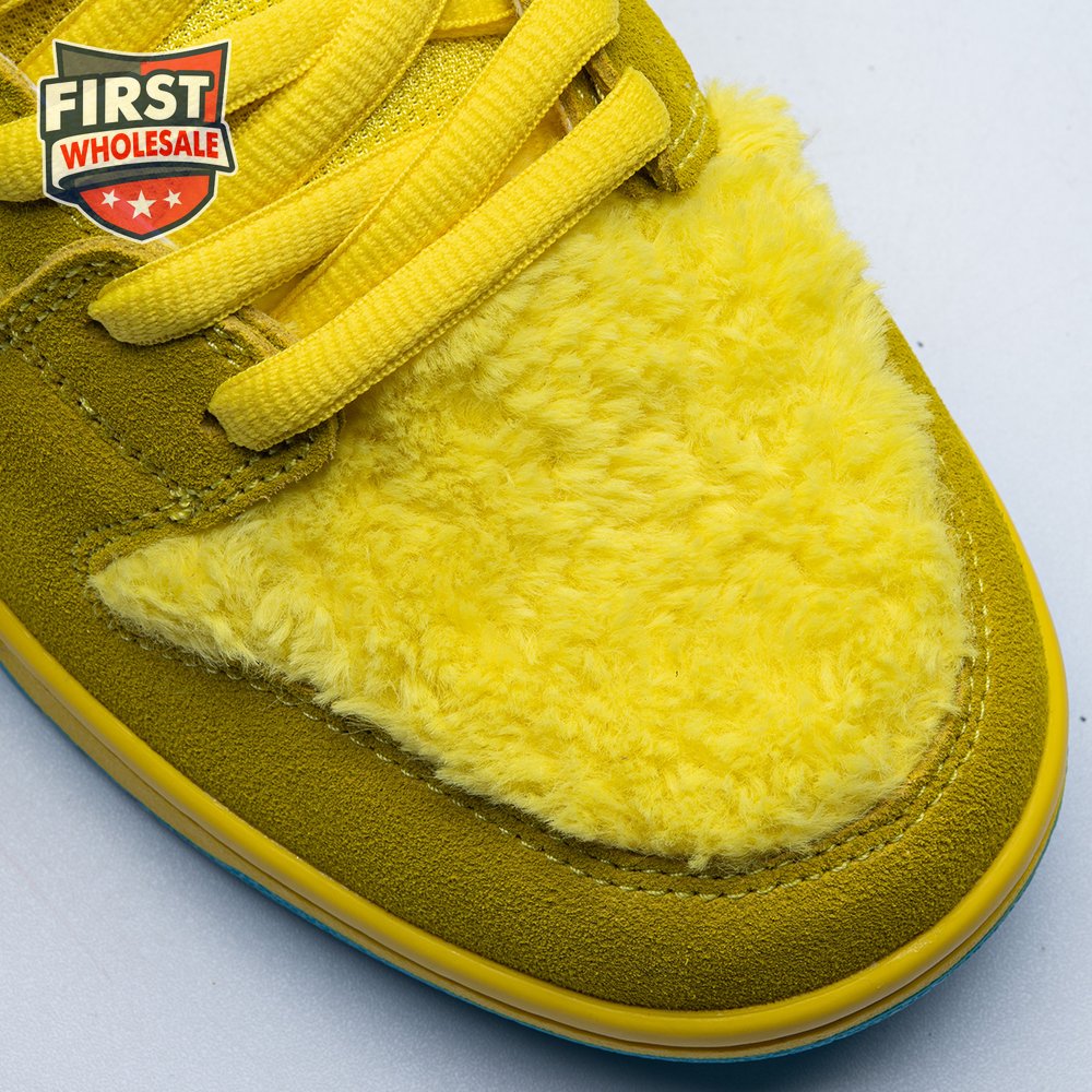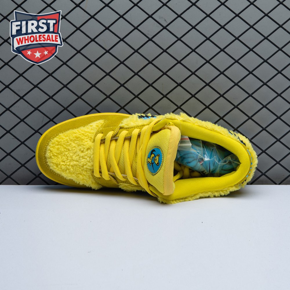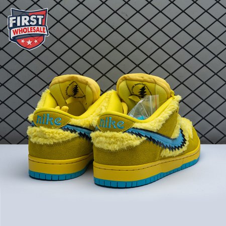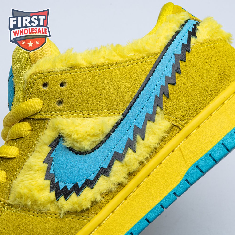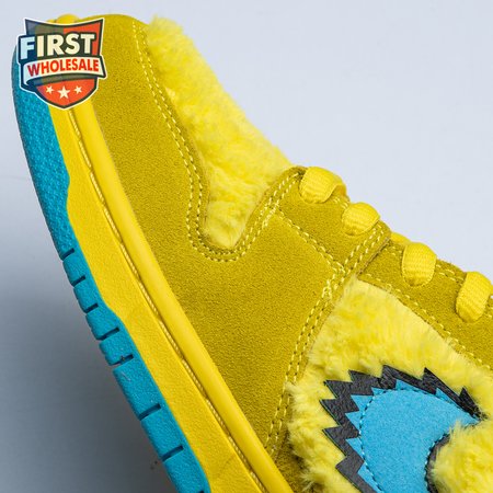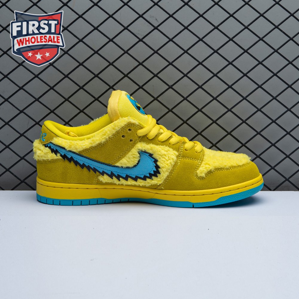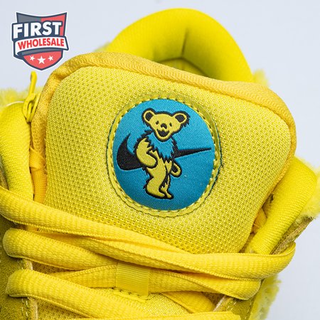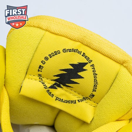 Developed in collaboration with the iconic San Francisco jam band, the Grateful Dead x Nike Dunk Low SB "Yellow Bear" features a unique design inspired by the back cover of "History of the Grateful Dead, Volume One (Bear"s Choice)," a live album originally released in 1973. A vibrant yellow finish is applied to the furry upper, fortified with tonal suede overlays and mounted atop a matching yellow foam midsole. Contrasting blue hits appear on the jagged Swoosh, rubber outsole and tongue, the latter furnished with a hidden stash pocket.