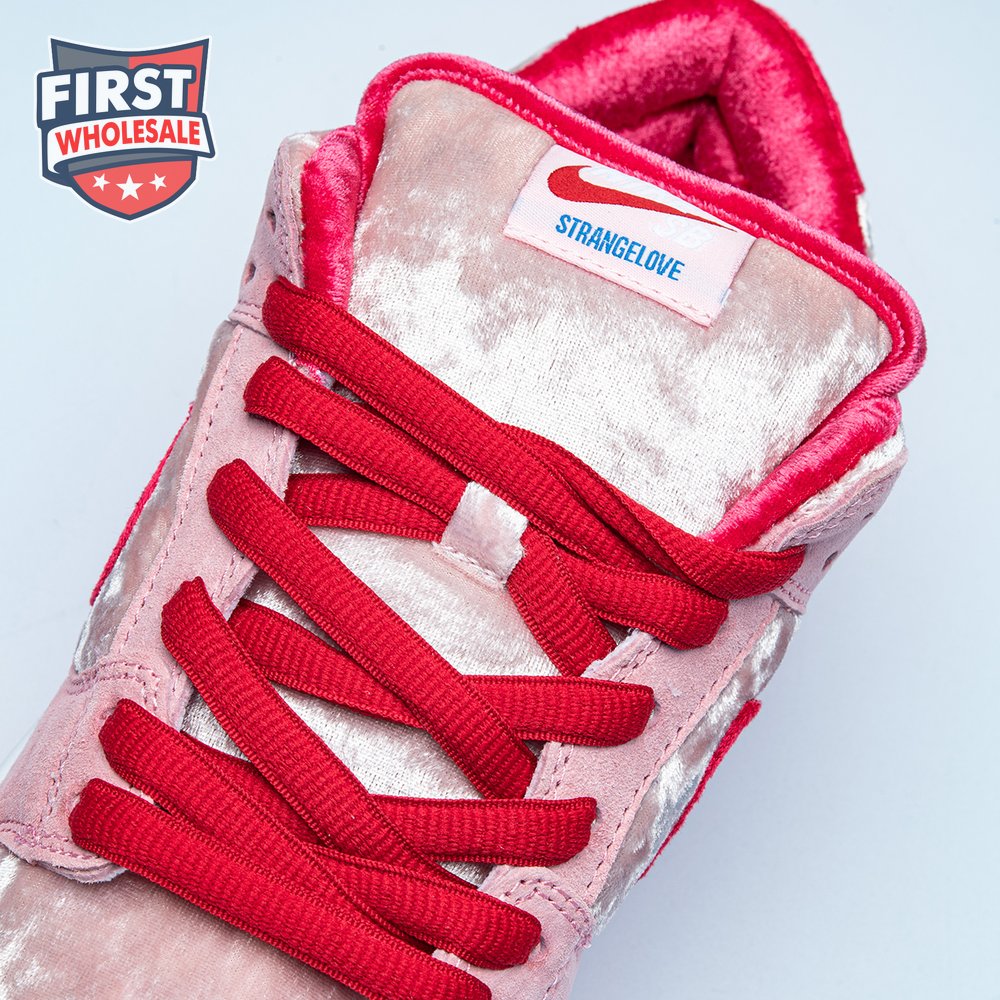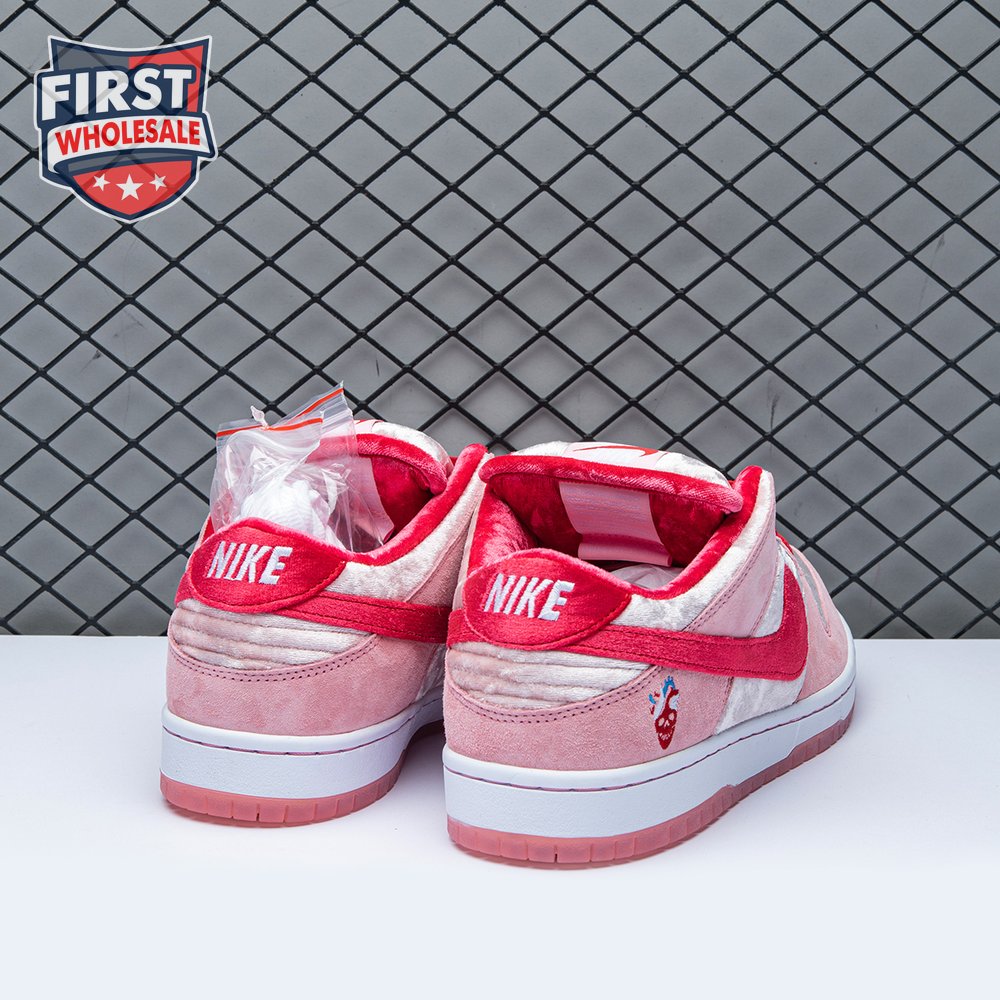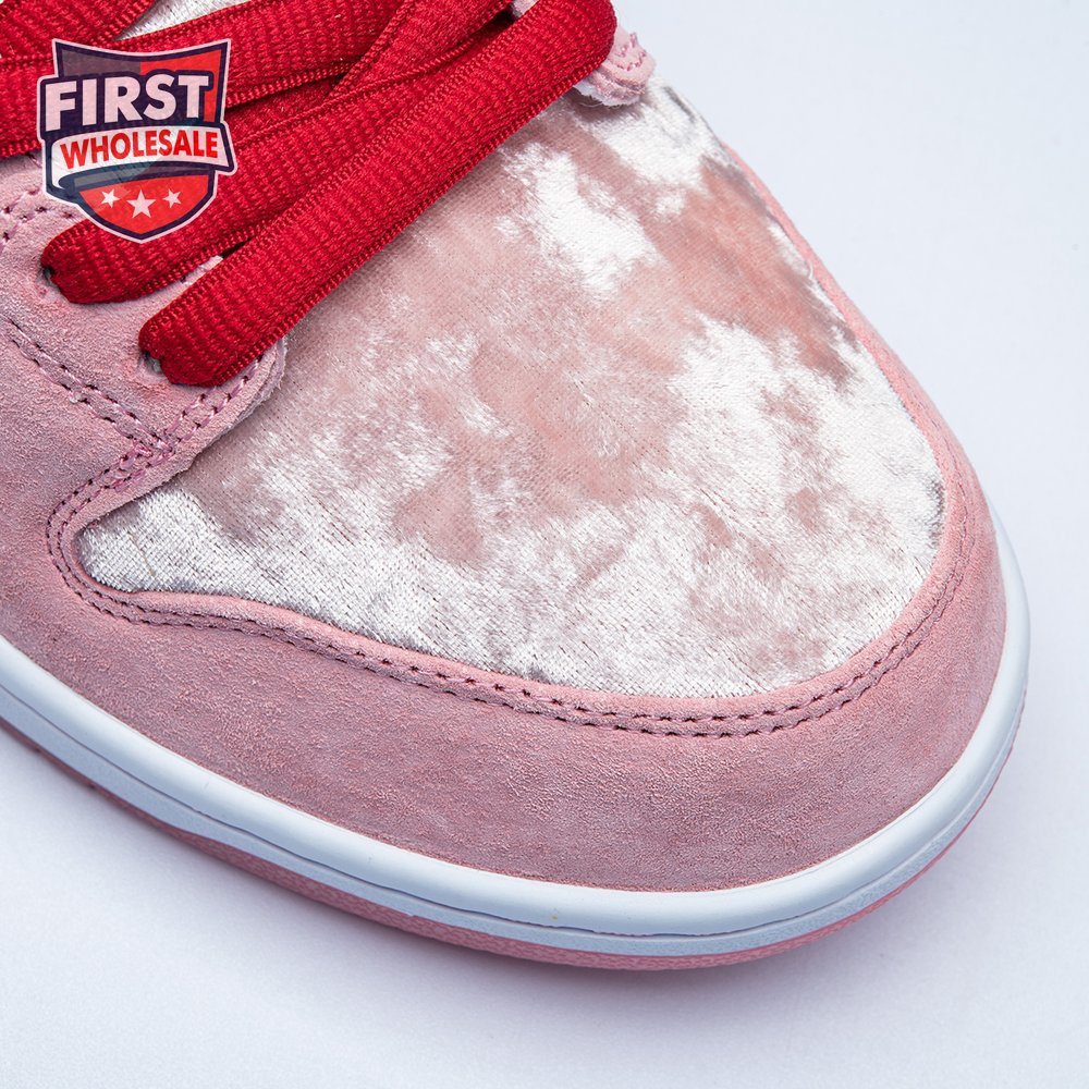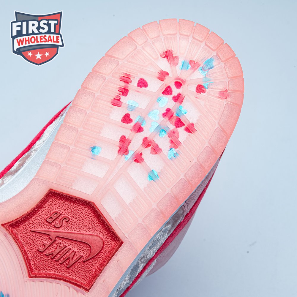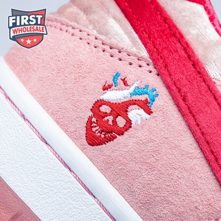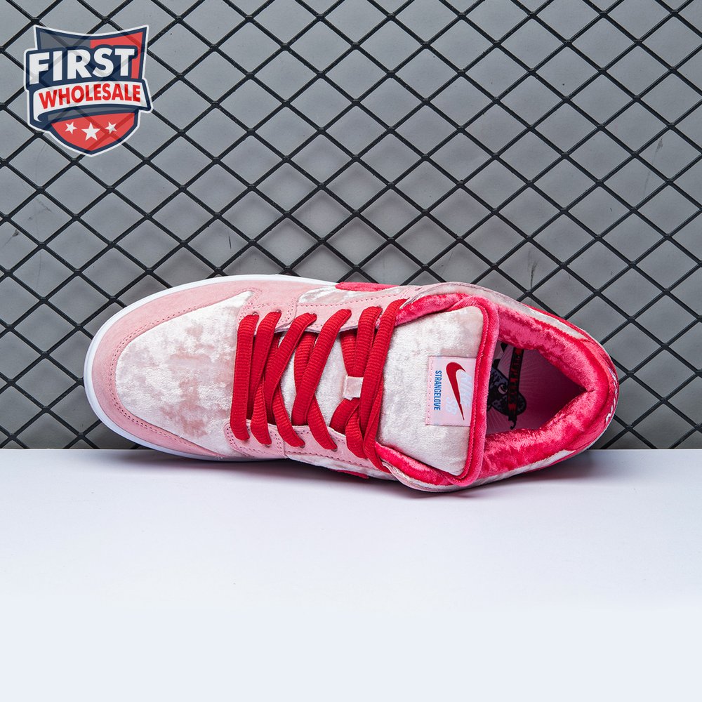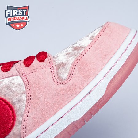 Made in collaboration with Sean Cliver"s skate brand, the StrangeLove x Dunk Low SB QS 'Valentine's Day' celebrates the romantic holiday with a plush take on the retro silhouette. The upper is constructed from white crushed velvet with pink suede overlays and a red velvet Swoosh. Cliver"s "Heart Skull" graphic is embroidered on the lateral heel, while the translucent pink rubber outsole reveals an array of scattered hearts in contrasting red and blue tones.