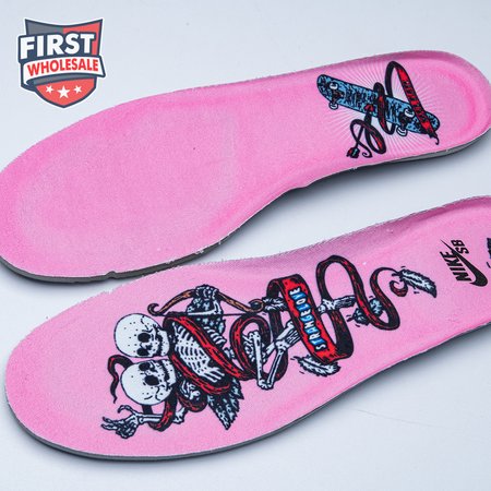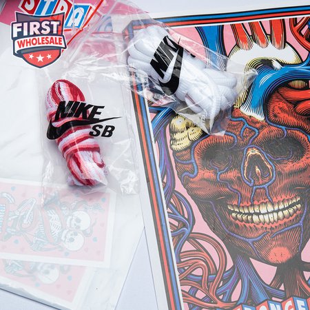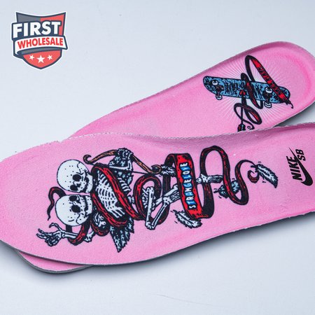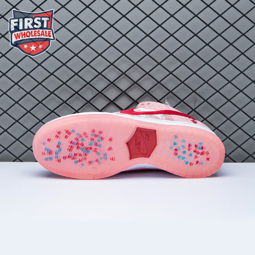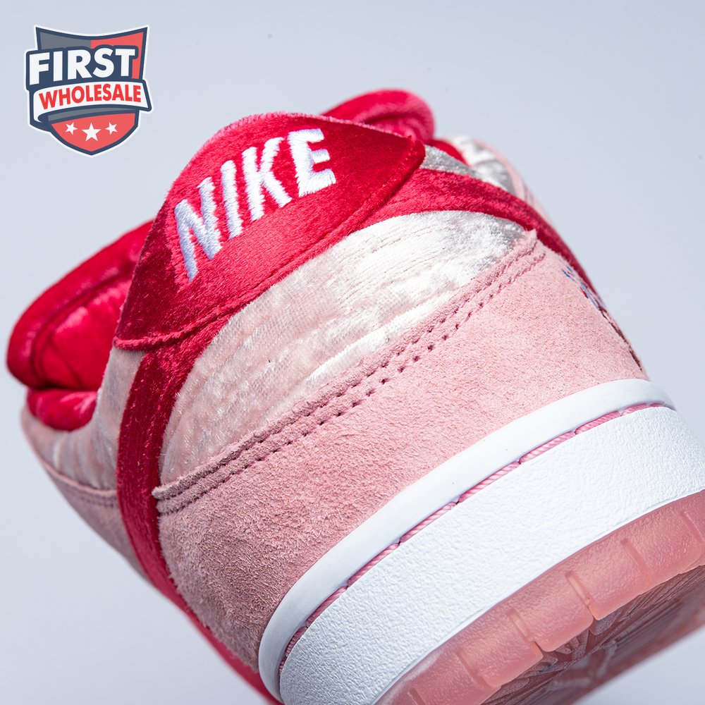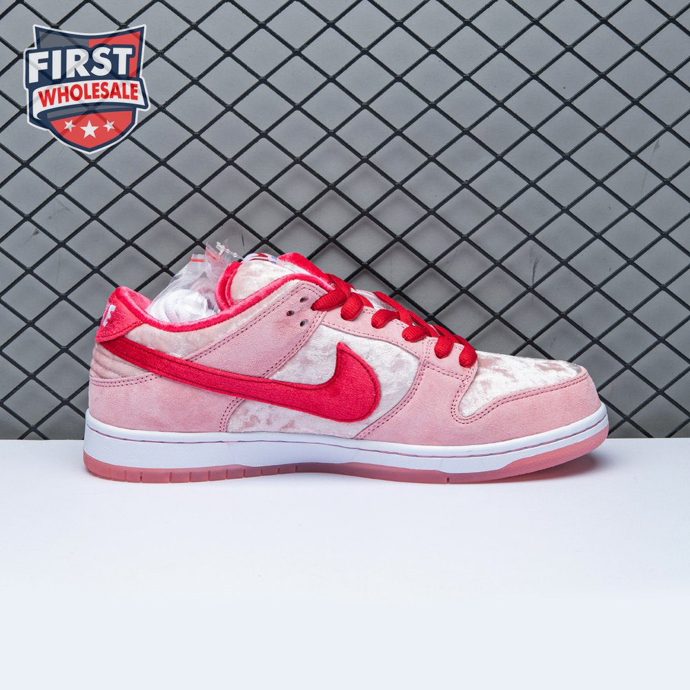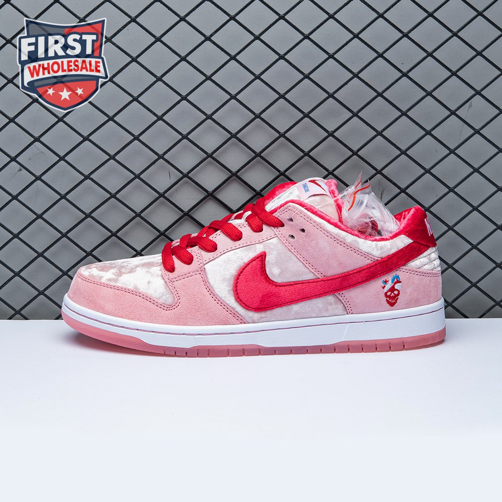 Made in collaboration with Sean Cliver"s skate brand, the StrangeLove x Dunk Low SB QS 'Valentine's Day' celebrates the romantic holiday with a plush take on the retro silhouette. The upper is constructed from white crushed velvet with pink suede overlays and a red velvet Swoosh. Cliver"s "Heart Skull" graphic is embroidered on the lateral heel, while the translucent pink rubber outsole reveals an array of scattered hearts in contrasting red and blue tones.