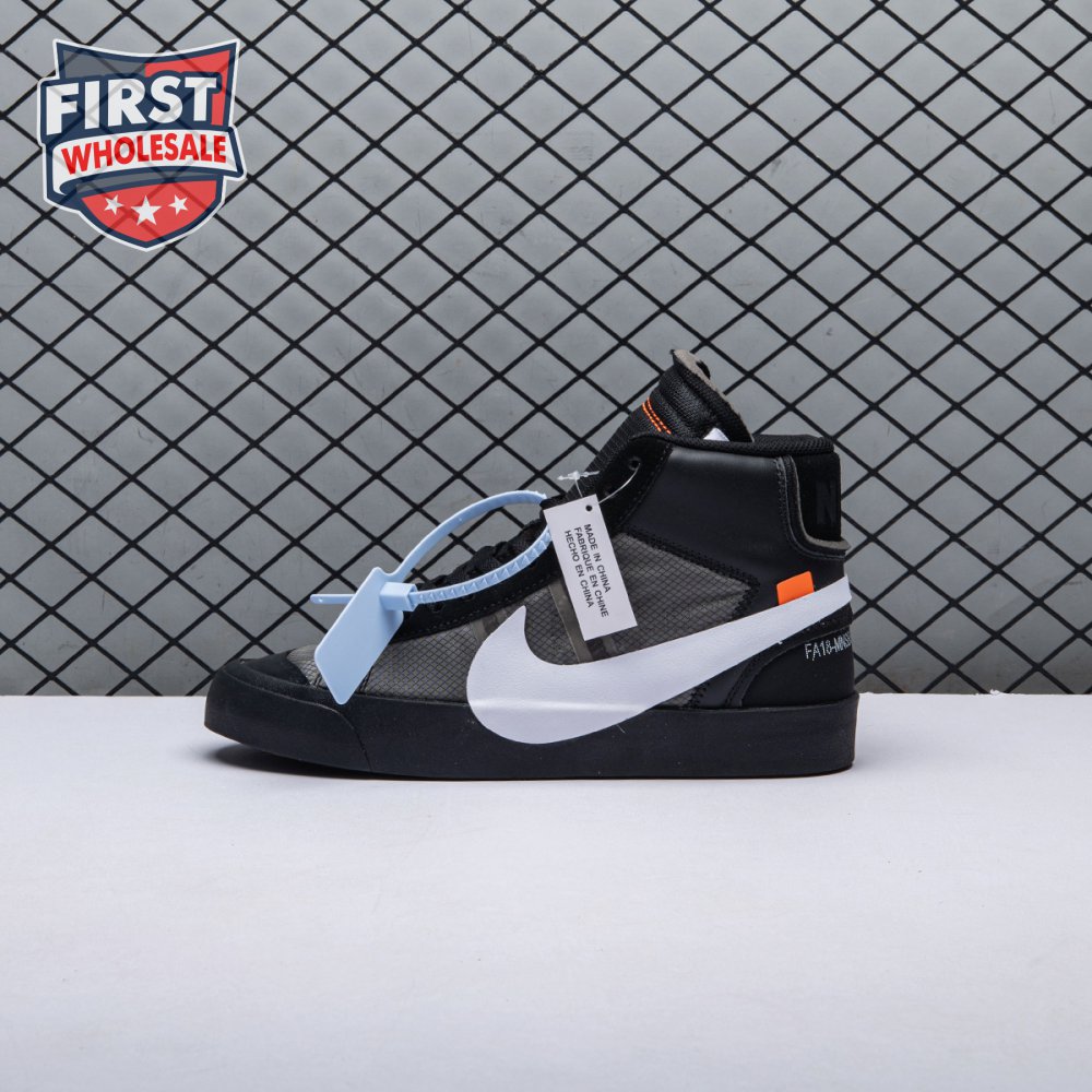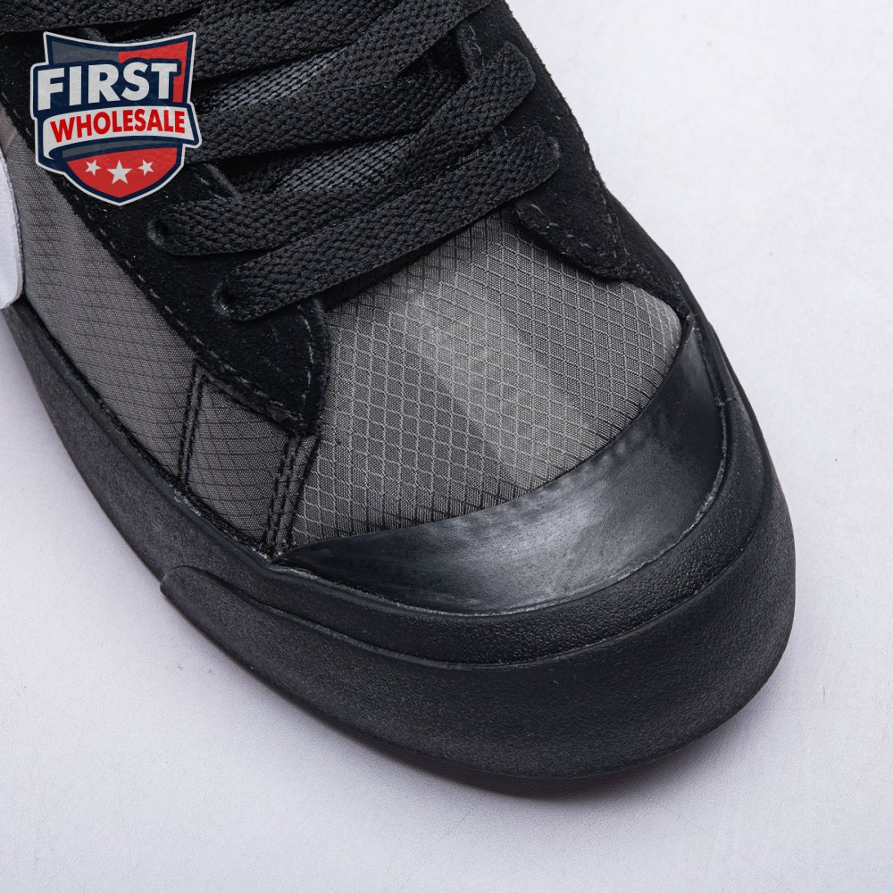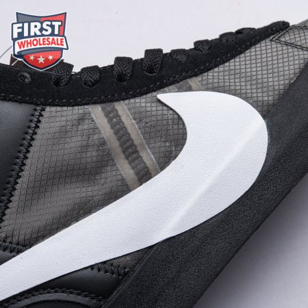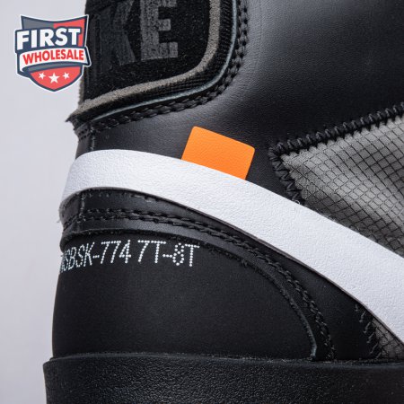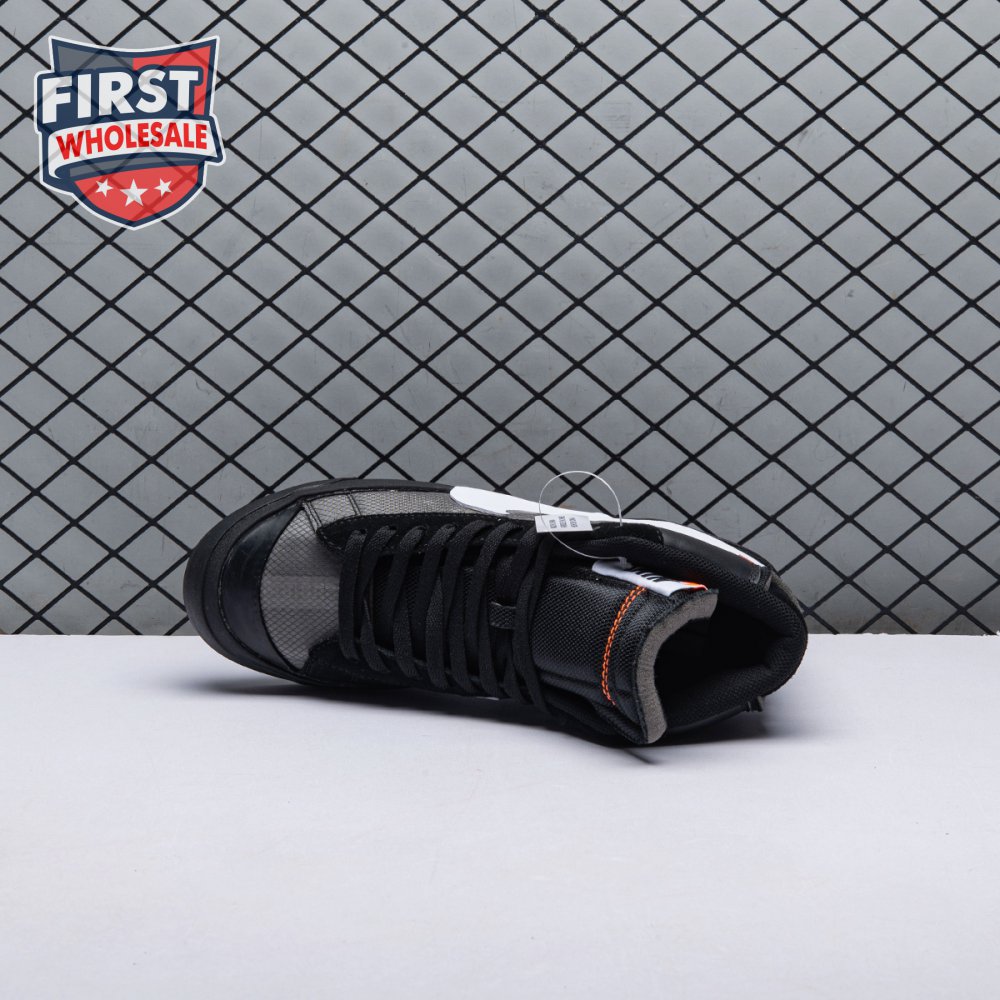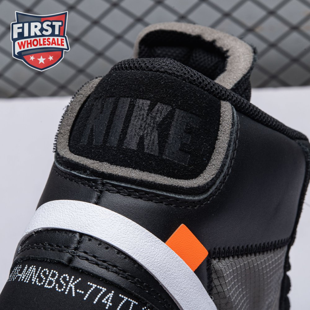 Releasing alongside an accompanying "All Hallow"s Eve" colorway in orange, the Off-White x Blazer Mid "Grim Reapers" completes Virgil Abloh"s Halloween-themed sneaker pack. The black and grey upper sports contrast orange stitching in celebration of the October holiday, along with an oversized white Swoosh, blue zip tie and Off-White lettering on the quarter panel of the shoe"s medial side.