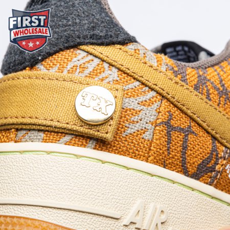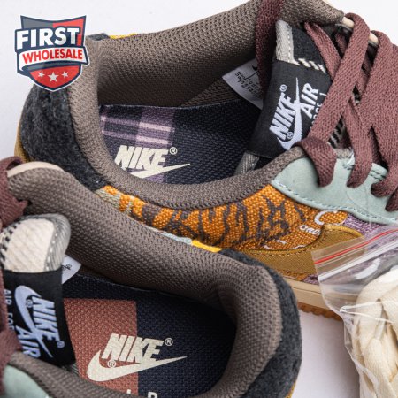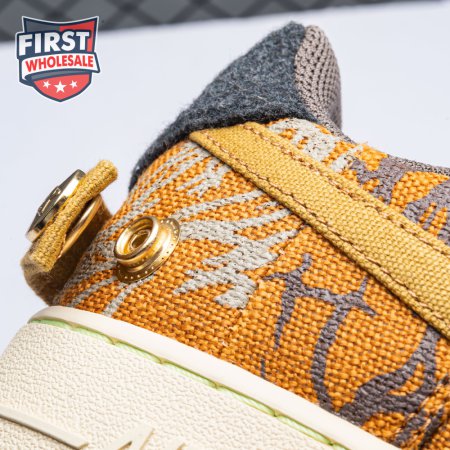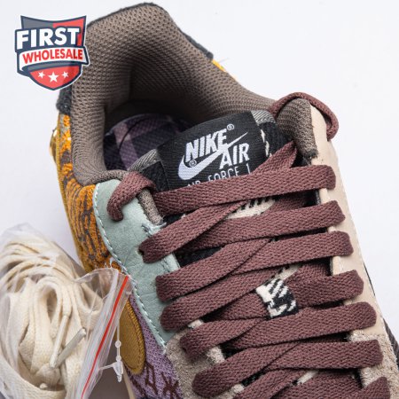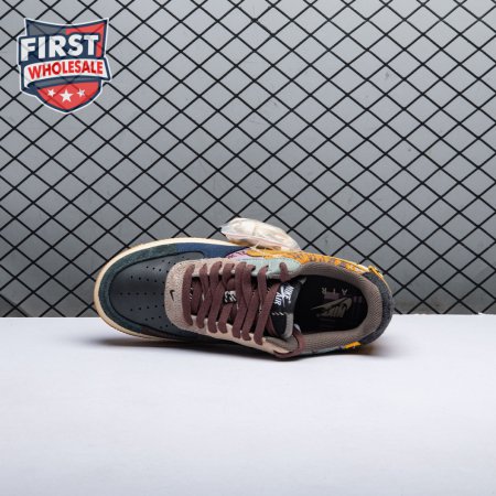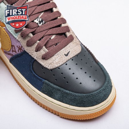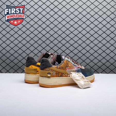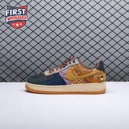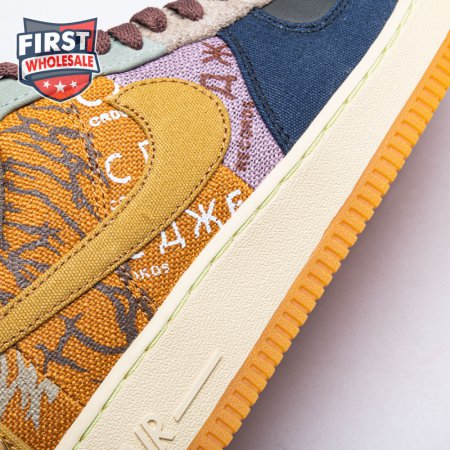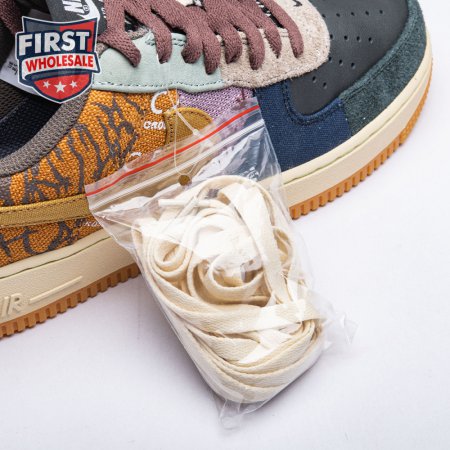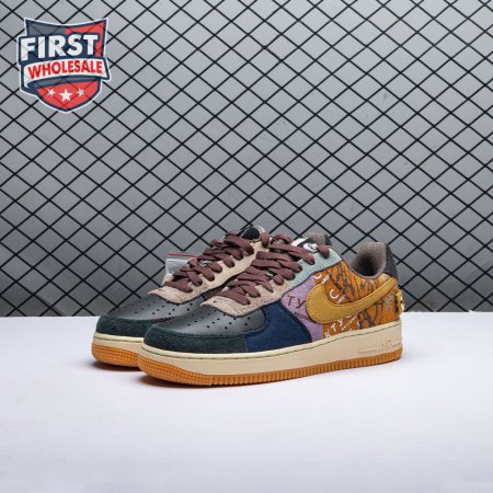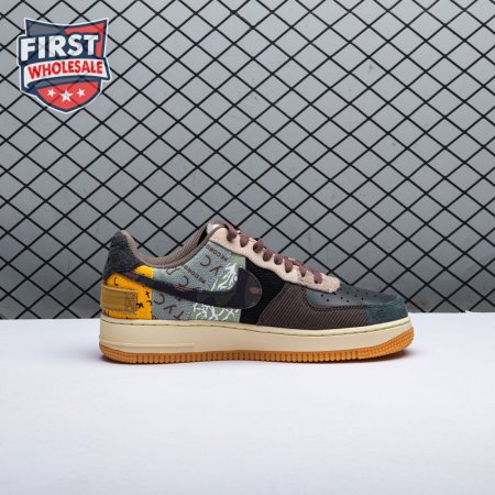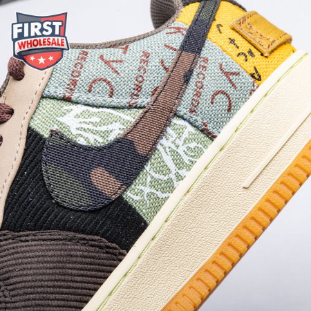 The Travis Scott x Air Force 1 Low 'Cactus Jack' is a unique creation featuring the rapper's trademark utilitarian cues. Released in November 2019, this edition has printed canvas, leather and suede uppers with zipped corduroy lace shrouds and different colored Swooshes on the sides. The sneaker rests atop a classic AF1 midsole and gum rubber outsole.