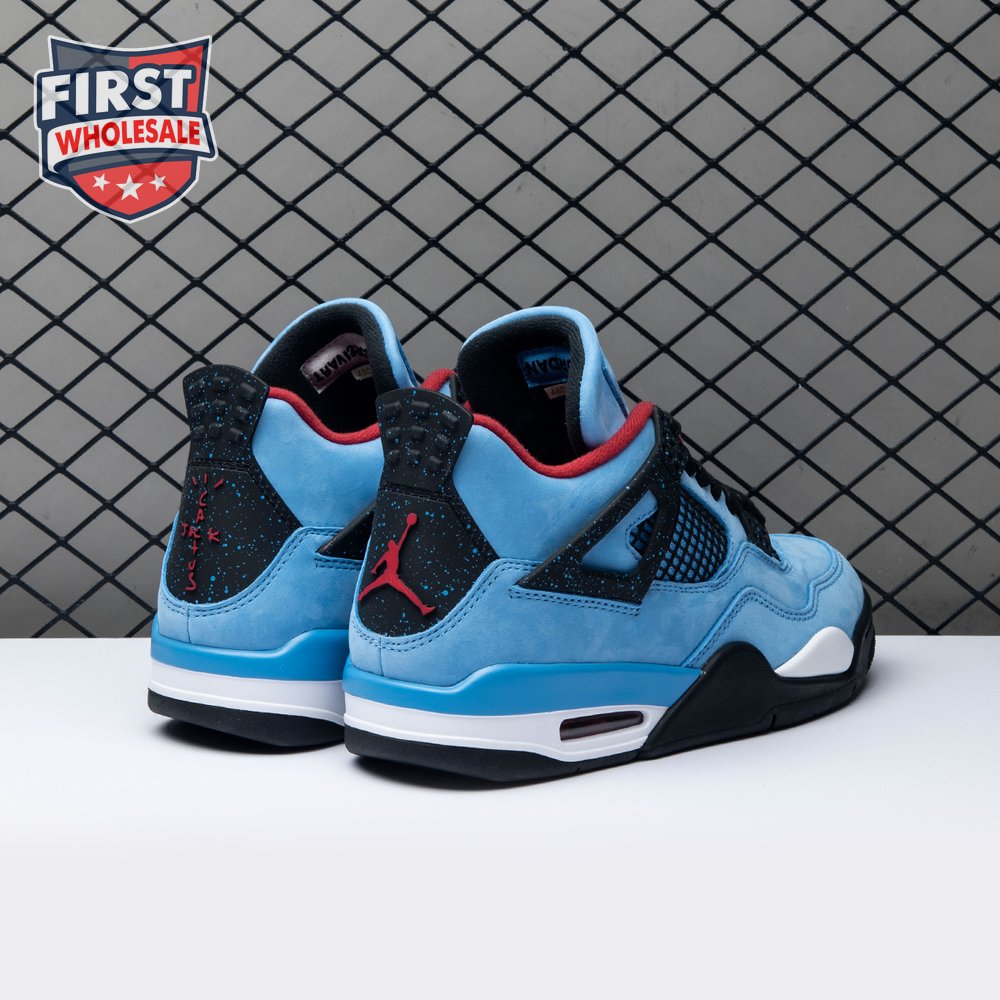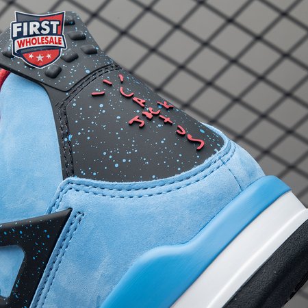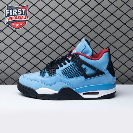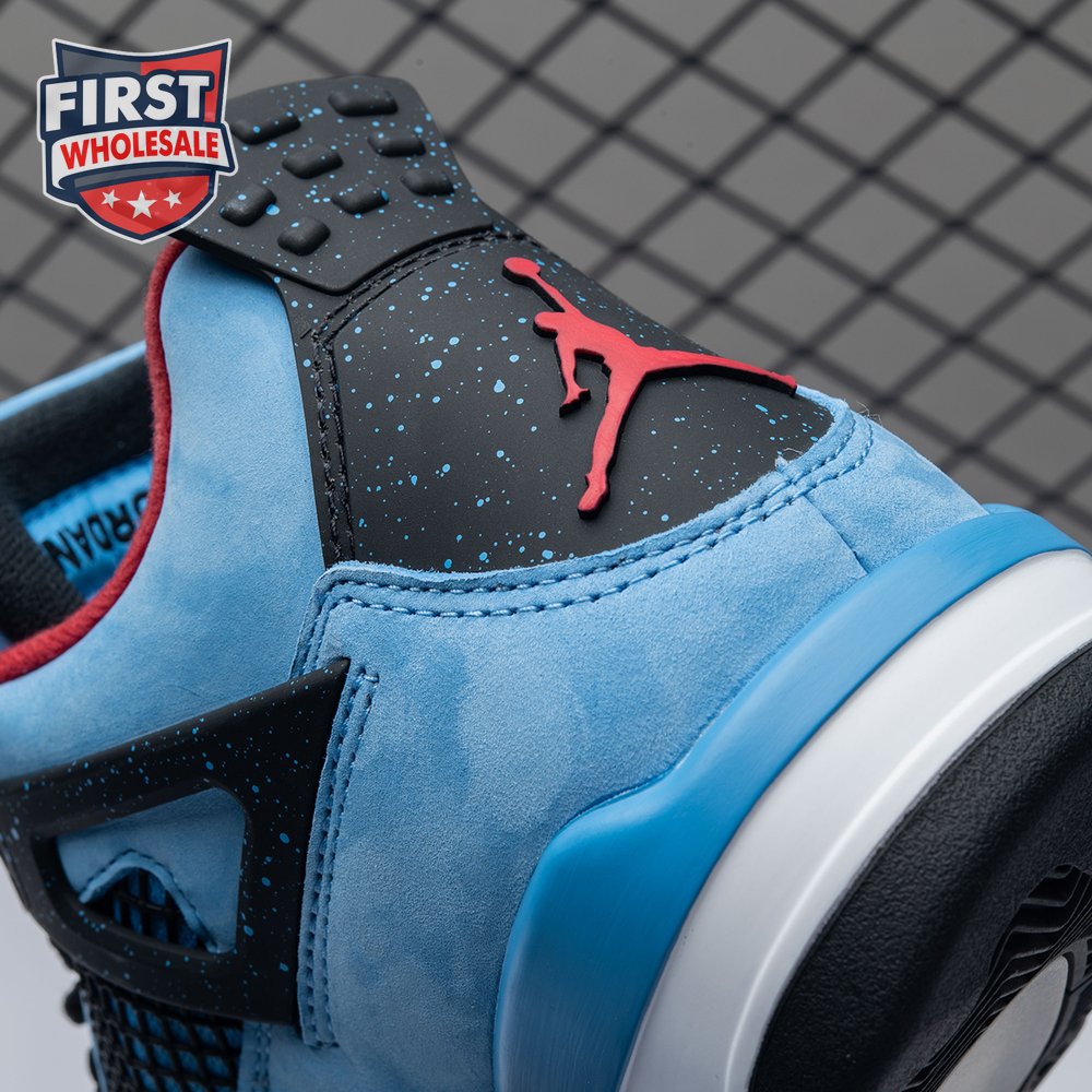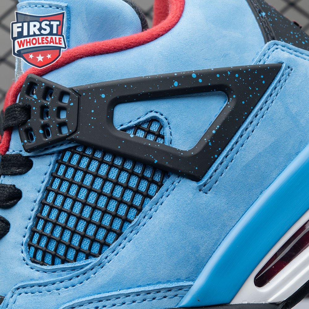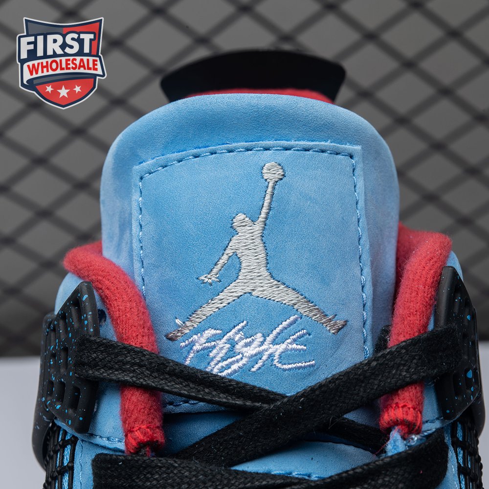 Music artist Travis Scott hails from Houston, where the Oilers used to take the field in red, white and blue uniforms. The Travis Scott x Air Jordan 4 Retro 'Cactus Jack' colorway pays tribute to the city"s bygone football team with a Durabuck leather upper dressed in University Blue and a Varsity Red insole. The black lace cage and a heel panel feature a light blue speckle pattern. Cactus Jack branding appears on the left heel in Varsity Red, with a matching Jumpman logo on the right.