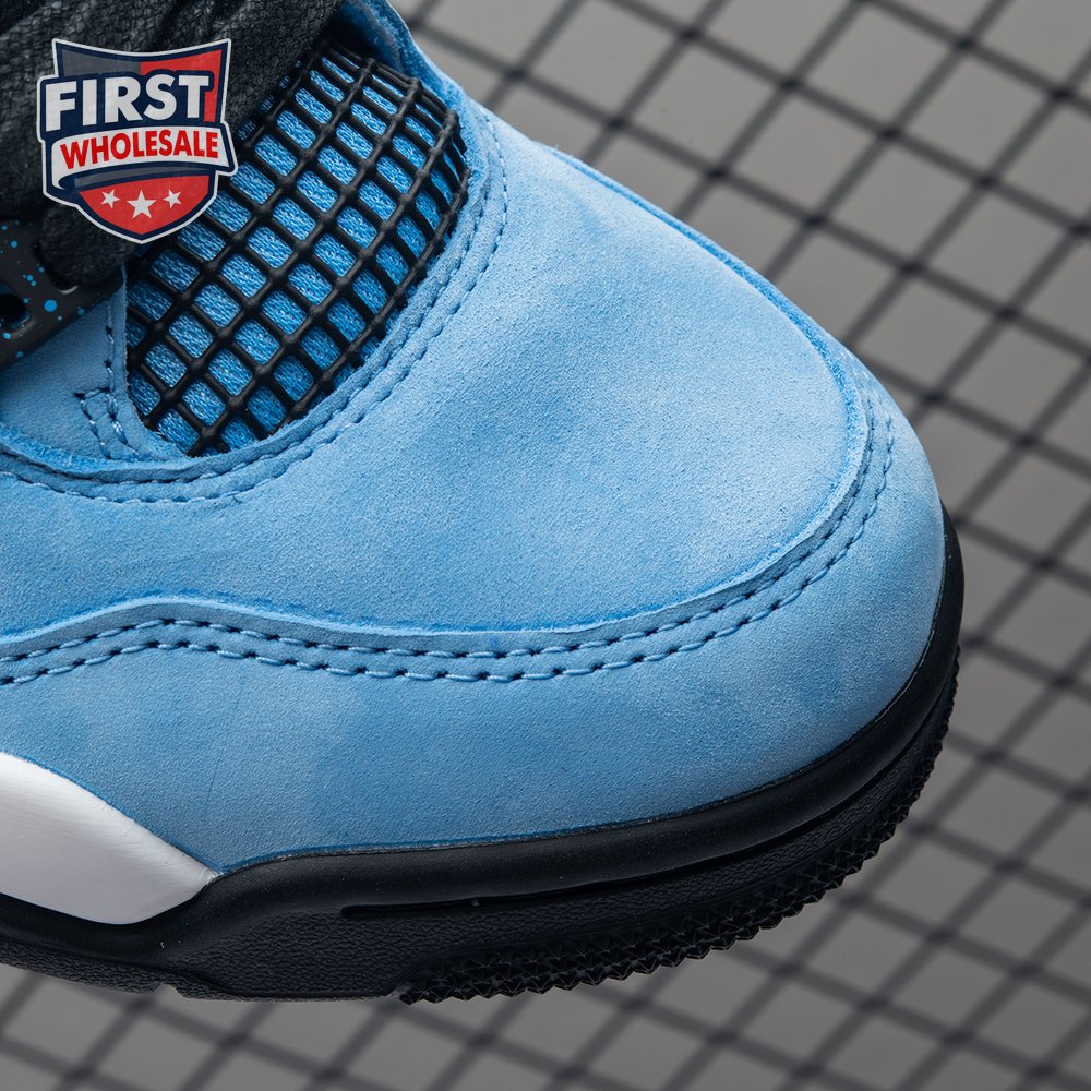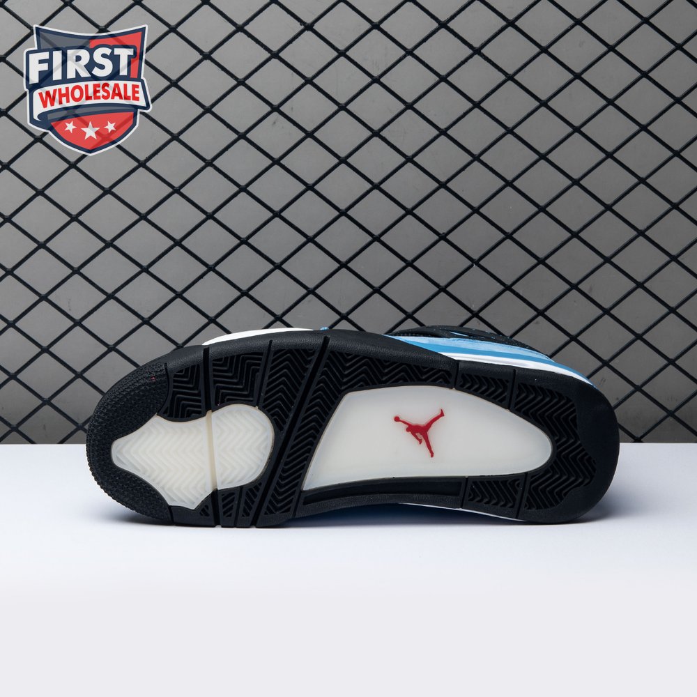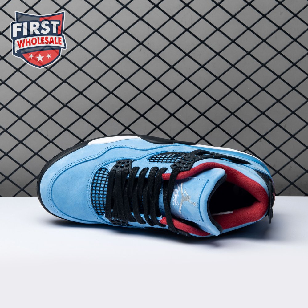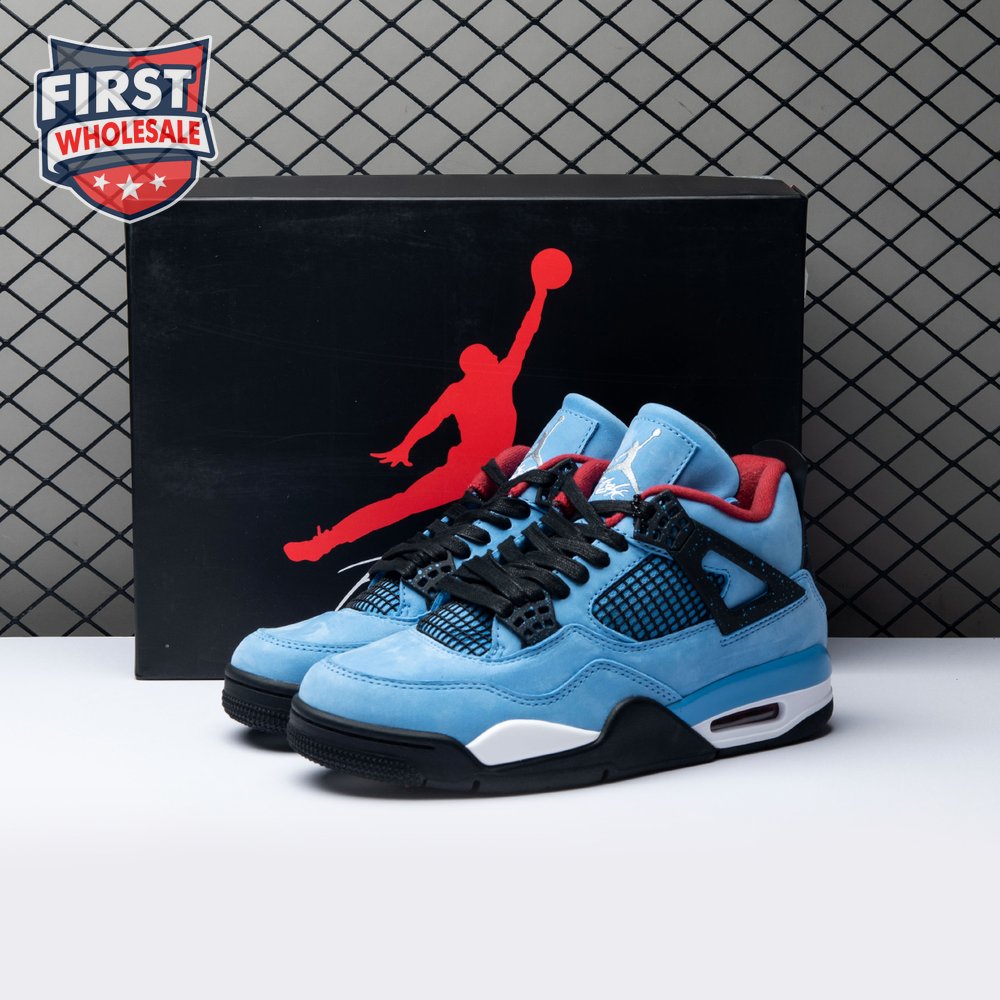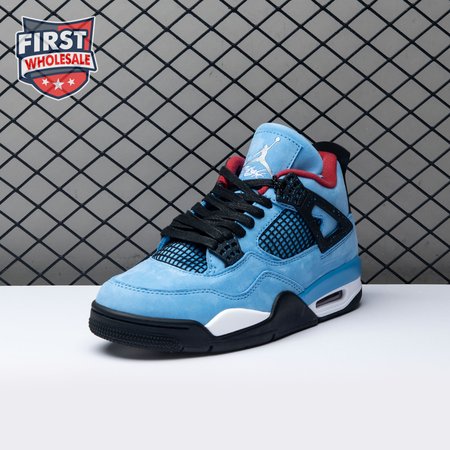 Music artist Travis Scott hails from Houston, where the Oilers used to take the field in red, white and blue uniforms. The Travis Scott x Air Jordan 4 Retro 'Cactus Jack' colorway pays tribute to the city"s bygone football team with a Durabuck leather upper dressed in University Blue and a Varsity Red insole. The black lace cage and a heel panel feature a light blue speckle pattern. Cactus Jack branding appears on the left heel in Varsity Red, with a matching Jumpman logo on the right.