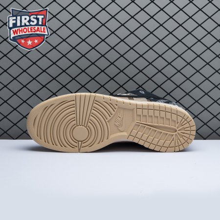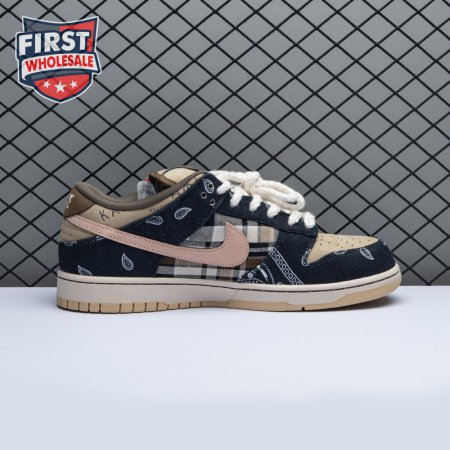 The Travis Scott x Dunk Low SB shows off a unique patchwork motif on the upper, featuring a tan leather base with plaid quarter panels and paisley print overlays, the latter made to tear away to reveal hidden elephant print underneath. The dueling patterns are complemented by rope laces, Cactus Jack tongue tags and mismatched black and pink Swooshes on each shoe. A white midsole and tan rubber outsole anchor the complex design.